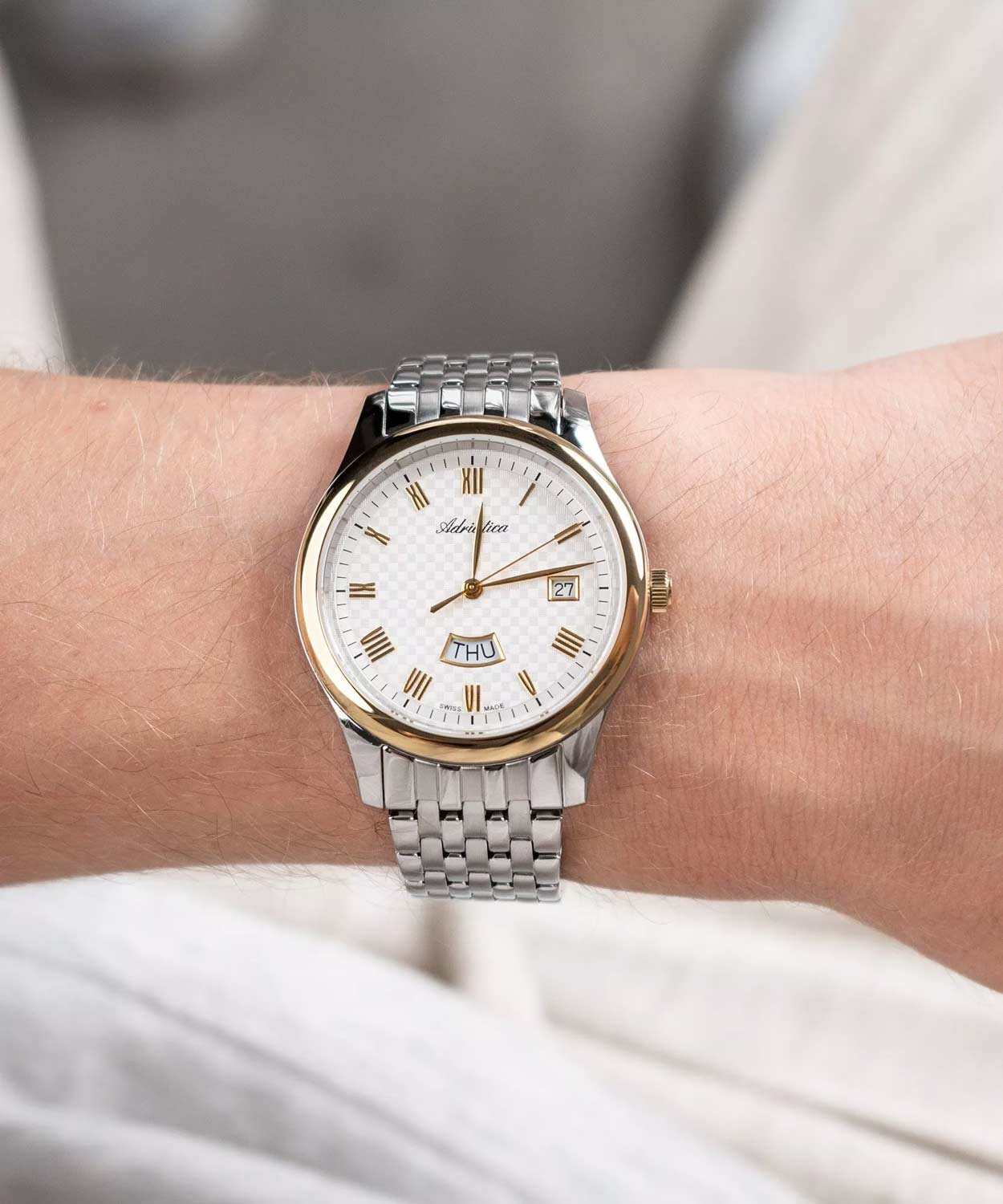 Часы Adriatica A1025.2163Q представляют собой идеальное сочетание элегантности и функциональности, разработанное для современных мужчин. Их стильный циферблат защищен сапфировым стекломСапфировое стеклоПрочный и надёжный материал из кристалла сапфира синтетического происхождения, характеризующийся особой твёрдостью и устойчивостью к царапинам и повреждениям., что придает дополнительную устойчивость к царапинам. Корпус из нержавеющей стали подчеркивает их изысканность и долговечность. Надежный кварцевый механизм с калибром RONDA 517 гарантирует точность времени, а водозащита WR 50 (5 ATM) обеспечивает защиту от воды в различных условиях. Браслет из нержавеющей стали с раскладной застёжкойРаскладная застёжкаТакой тип застёжки используется только на браслетах из металла. Она никогда не раскрывается полностью, происходит разделение на 2 и более частей. Раскладывающая застёжка снизит вероятность потери часов к минимуму., гармонично дополняет общий дизайн и обеспечивает комфортное ношение на запястье. Окошко даты находится в положении 3 часа. День недели отображается в положении 6 часов. БезельБезельВнешний ободок, закрепляющий стекло. В спортивных часах так называется поворотное кольцо с делениями на циферблате, выполняет роль таймера – замеряет отрезки времени на шкале. Неподвижный безель – элемент декора. Однонаправленно вращающийся безель на дайверских часах позволяет фиксировать моменты погружения и выныривания на поверхность. с PVD-покрытиемPVDУльтратонкое покрытие наносится в технике вакуумного напыления, сочетает в себе нитрид титана особой прочности со слоем золота или оксида хрома. Несёт в себе декоративную или защитную функцию..