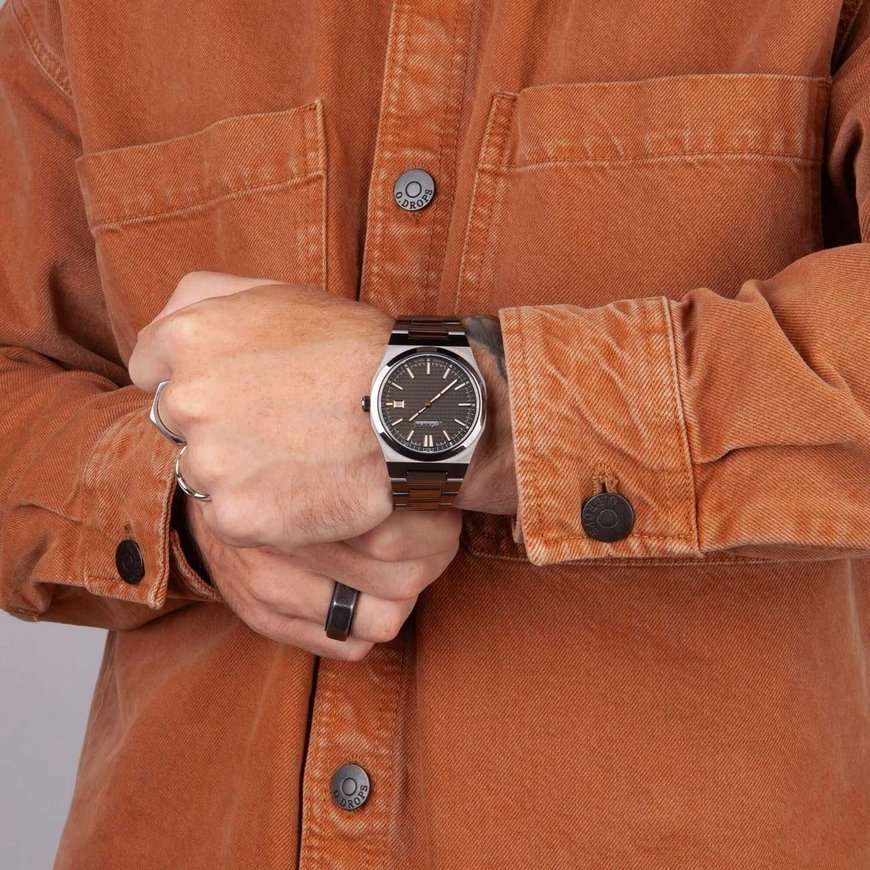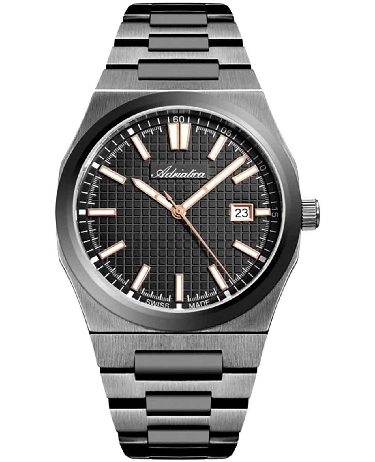Часы Adriatica A8326.S1R6Q воплощают в себе элегантность и функциональность, идеально подходящие для современных мужчин, ценящих швейцарское качество. Их черный циферблат защищенный сапфировым стекломСапфировое стеклоПрочный и надёжный материал из кристалла сапфира синтетического происхождения, характеризующийся особой твёрдостью и устойчивостью к царапинам и повреждениям., заключен в черный корпус с безелемБезельВнешний ободок, закрепляющий стекло. В спортивных часах так называется поворотное кольцо с делениями на циферблате, выполняет роль таймера – замеряет отрезки времени на шкале. Неподвижный безель – элемент декора. Однонаправленно вращающийся безель на дайверских часах позволяет фиксировать моменты погружения и выныривания на поверхность. из нержавеющей стали c PVDPVDУльтратонкое покрытие наносится в технике вакуумного напыления, сочетает в себе нитрид титана особой прочности со слоем золота или оксида хрома. Несёт в себе декоративную или защитную функцию. покрытием. Надежный кварцевый механизм с калибром ETA F06 обеспечивает высокую точность, а водозащита 5 ATM делает часы устойчивыми к воздействию воды. Стальной браслет c PVDPVDУльтратонкое покрытие наносится в технике вакуумного напыления, сочетает в себе нитрид титана особой прочности со слоем золота или оксида хрома. Несёт в себе декоративную или защитную функцию. покрытием и раскладной застёжкойРаскладная застёжкаТакой тип застёжки используется только на браслетах из металла. Она никогда не раскрывается полностью, происходит разделение на 2 и более частей. Раскладывающая застёжка снизит вероятность потери часов к минимуму. обеспечивает комфортное и надежное ношение. Часы оснащены функцией отображения даты в окошке в положении 3 часа, что добавляет практичности в повседневной жизни. Люминесцентное покрытиеЛюминесцентное покрытиеПозволяет считывать показания времени в темноте. Производители наносят на стрелки, часовые индексы, безель или поверхность циферблата светонакопительный состав, дающий холодное свечение. на стрелках и метках обеспечивает отличную видимость в темноте.