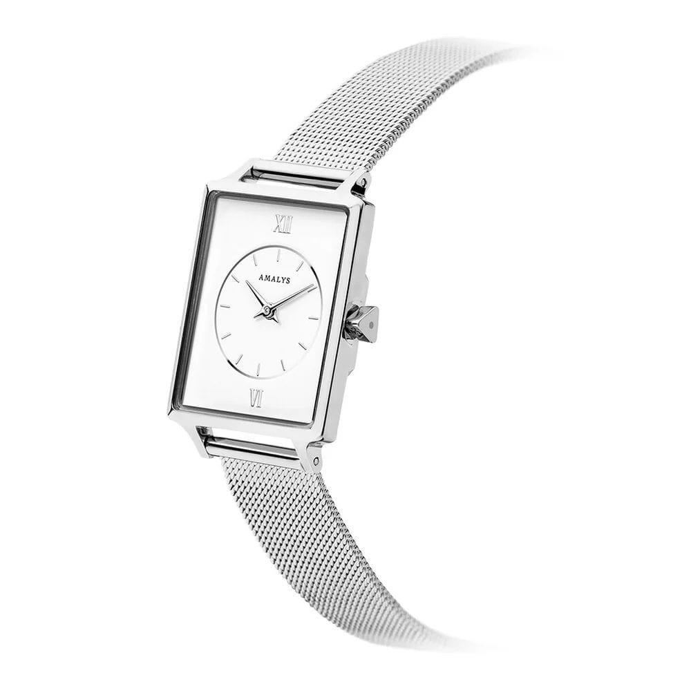 Amalys AMW-046 — женская модель с утончённой минималистичной эстетикой, где корпус размером 23 мм подчёркивает современный характер и чистоту линий. Механизм — точный кварцевый, обеспечивающий стабильный ход и надёжность в повседневном использовании. Поверхность циферблата оформлена в лаконичном стиле с тонкими метками и стрелками, создающими гармонию и визуальную лёгкость. Защитную функцию выполняет минеральное стеклоМинеральное стеклоМинеральное стекло представляет собой искусственно выращенный минерал кварца. Такое стекло отличается особой устойчивостью к повреждениям и царапинам. Уступает по некоторым качествам сапфировому стеклу., устойчивое к механическим воздействиям и сохраняющее читаемость при ежедневной носке. Браслет выполнен в виде «миланской сетки» шириной 14 мм, оснащён раскладным замкомРаскладной замокДанный вариант застежки используется только на часах с металлическим браслетом. Отличительная особенность такого крепления в том, что длина браслета становится универсальной и вы можете самостоятельно отрегулировать нужный вам размер – застежка просто двигается по браслету часов., его гибкая структура обеспечивает комфортное прилегание к запястью и визуальную утончённость. Единство корпуса и браслета создаёт целостный образ, а изысканная простота дизайна делает модель универсальной — она одинаково уместна и в деловой обстановке, и в повседневных сочетаниях.