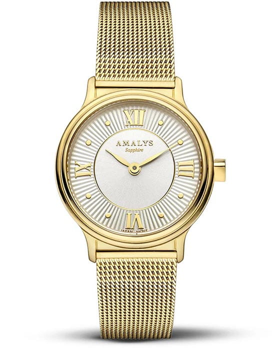 Amalys AMW-168 — женская модель с утончённым классическим дизайном, в которой сочетаются элегантность и практичность. Круглый корпус диаметром 28 мм выполнен из нержавеющей стали с PVD-покрытиемPVDУльтратонкое покрытие наносится в технике вакуумного напыления, сочетает в себе нитрид титана особой прочности со слоем золота или оксида хрома. Несёт в себе декоративную или защитную функцию., гармонирующим с браслетом шириной 14 мм в том же исполнении. Защитную функцию выполняет сапфировое стеклоСапфировое стеклоПрочный и надёжный материал из кристалла сапфира синтетического происхождения, характеризующийся особой твёрдостью и устойчивостью к царапинам и повреждениям., стойкое к царапинам и сохраняющее прозрачность. Механизм — кварцевый, обеспечивающий точность и стабильность хода. Браслет миланского плетения с PVD-покрытиемPVDУльтратонкое покрытие наносится в технике вакуумного напыления, сочетает в себе нитрид титана особой прочности со слоем золота или оксида хрома. Несёт в себе декоративную или защитную функцию. снабжён раскладным замкомРаскладной замокДанный вариант застежки используется только на часах с металлическим браслетом. Отличительная особенность такого крепления в том, что длина браслета становится универсальной и вы можете самостоятельно отрегулировать нужный вам размер – застежка просто двигается по браслету часов., который сочетает надёжность фиксации и удобство повседневного использования. Водозащита 5 ATM защищает часы от случайных брызг и дождя. Циферблат с римскими индексами и изящными стрелками подчёркивает классическую эстетику модели, делая её уместной как в повседневных образах, так и в торжественной обстановке.