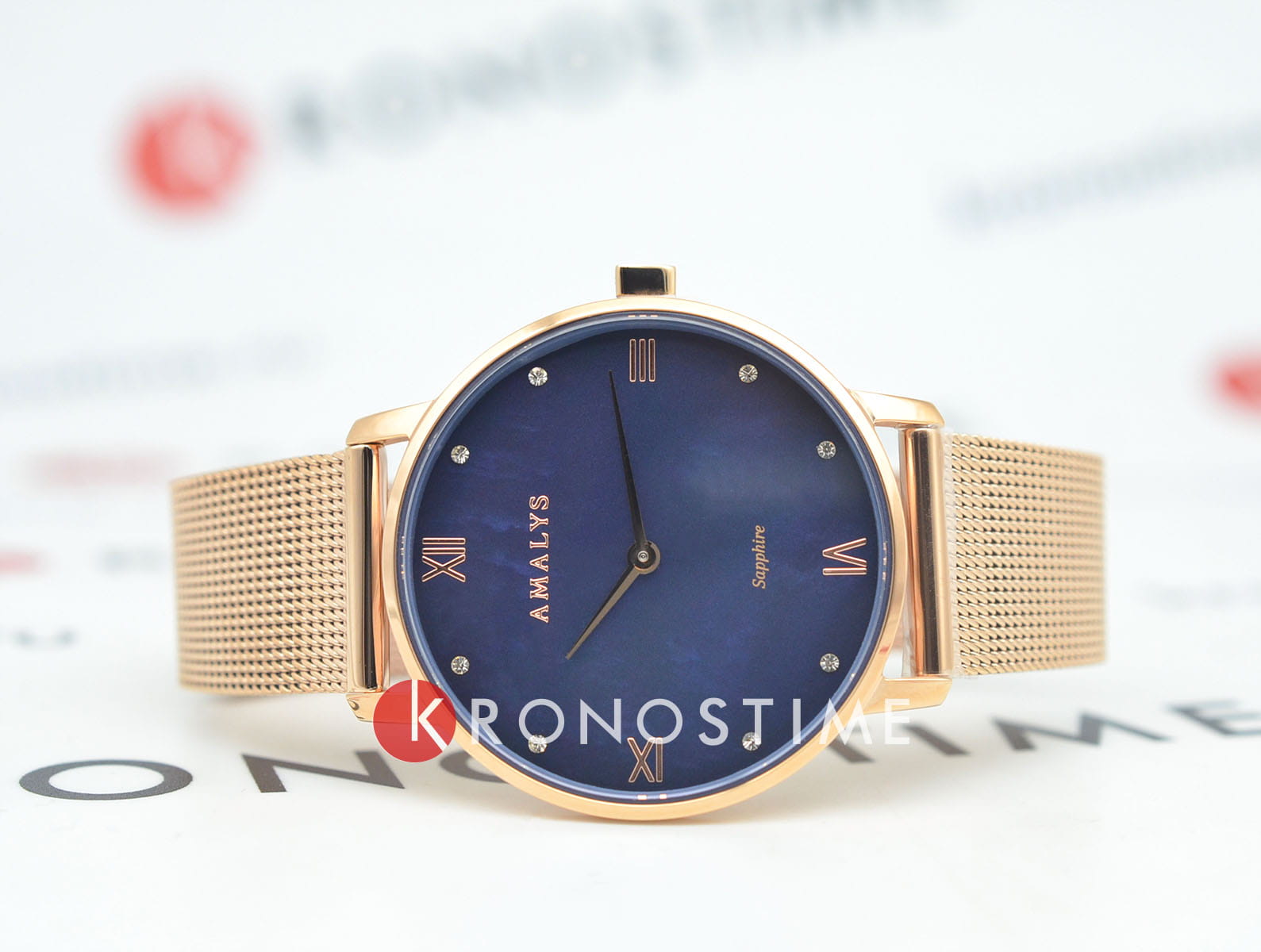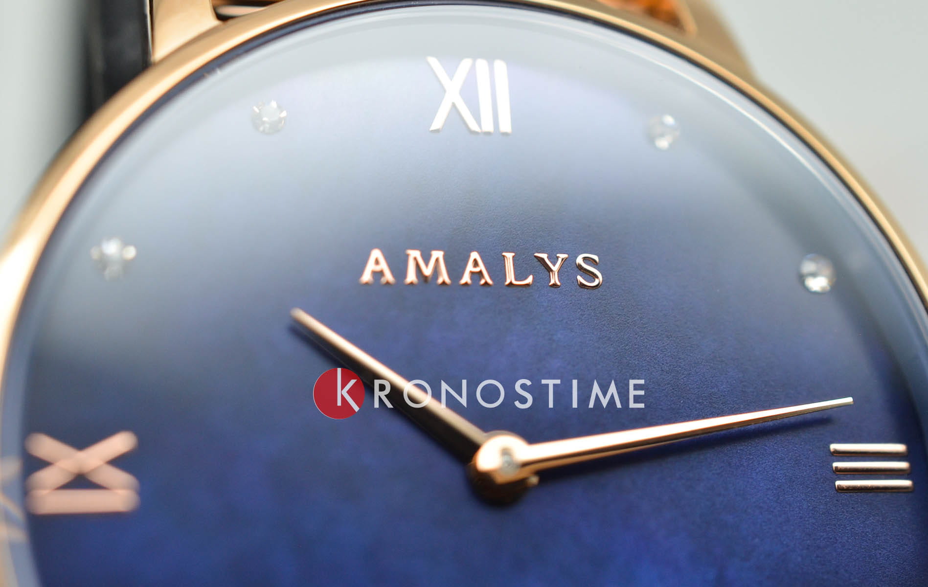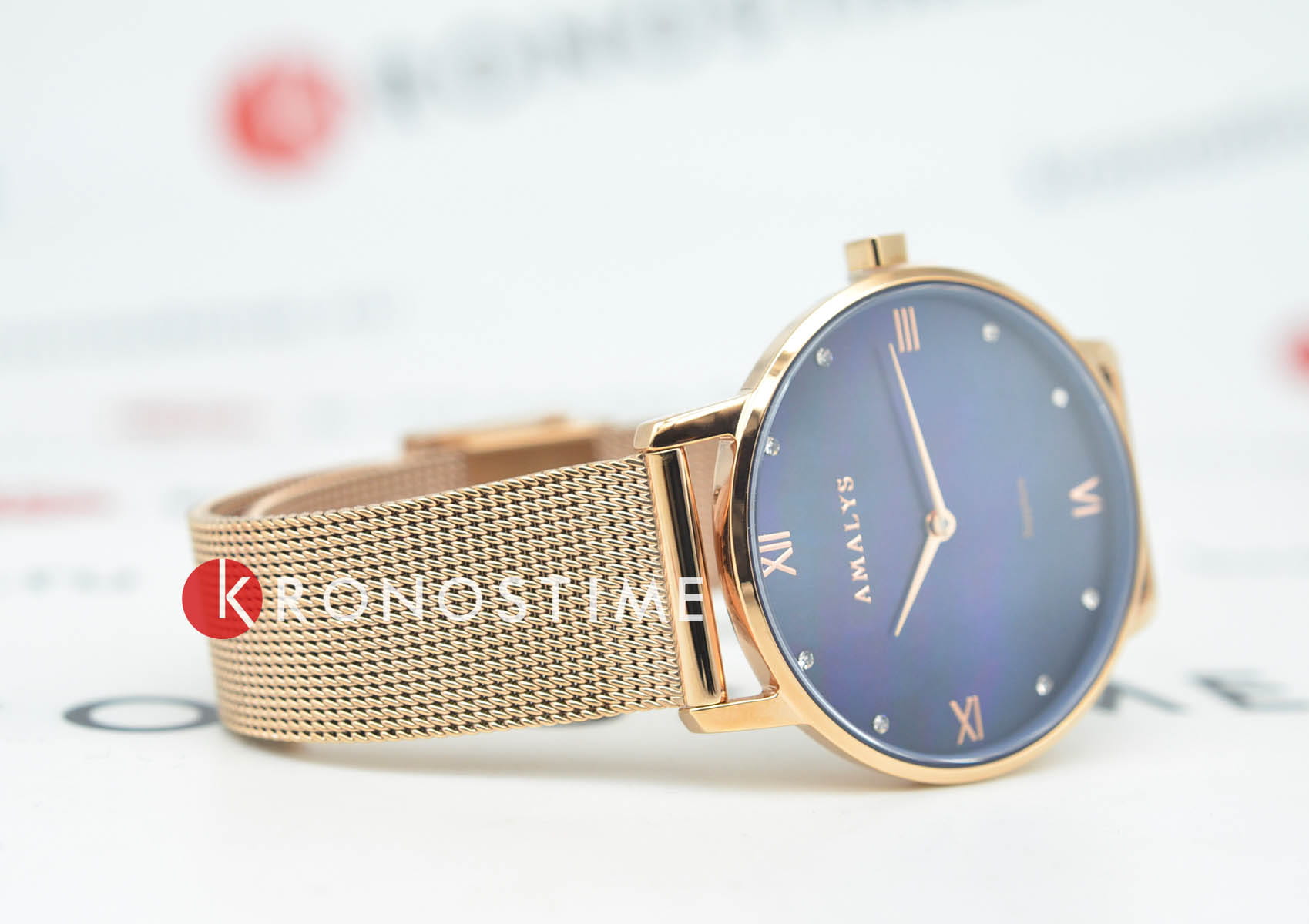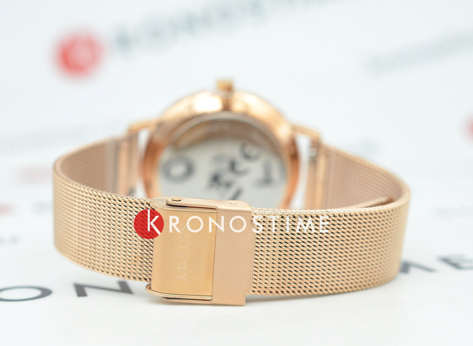 Amalys AMW-182 — женская модель с утончённым классическим дизайном, в которой сочетаются элегантность и практичность. Круглый корпус диаметром 33 мм выполнен из нержавеющей стали с PVD-покрытиемPVDУльтратонкое покрытие наносится в технике вакуумного напыления, сочетает в себе нитрид титана особой прочности со слоем золота или оксида хрома. Несёт в себе декоративную или защитную функцию., гармонирующим с браслетом шириной 16 мм в том же исполнении. Защитную функцию выполняет сапфировое стеклоСапфировое стеклоПрочный и надёжный материал из кристалла сапфира синтетического происхождения, характеризующийся особой твёрдостью и устойчивостью к царапинам и повреждениям., стойкое к царапинам и сохраняющее прозрачность. Механизм — кварцевый, обеспечивающий точность и стабильность хода. Стальной браслет с PVD-покрытиемPVDУльтратонкое покрытие наносится в технике вакуумного напыления, сочетает в себе нитрид титана особой прочности со слоем золота или оксида хрома. Несёт в себе декоративную или защитную функцию. миланского плетения на раскладном замкеРаскладной замокДанный вариант застежки используется только на часах с металлическим браслетом. Отличительная особенность такого крепления в том, что длина браслета становится универсальной и вы можете самостоятельно отрегулировать нужный вам размер – застежка просто двигается по браслету часов. который сочетает надёжность фиксации и удобство повседневного использования. Водозащита 3 ATM защищает часы от случайных брызг и дождя. Циферблат с римскими индексами и изящными стрелками подчёркивает классическую эстетику модели, делая её уместной как в повседневных образах, так и в торжественной обстановке.