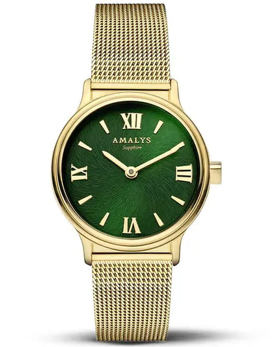 Amalys AMW-201 — женская модель с утончённым классическим дизайном, в которой сочетаются элегантность и практичность. Круглый корпус диаметром 28 мм выполнен из нержавеющей стали с PVD-покрытиемPVDУльтратонкое покрытие наносится в технике вакуумного напыления, сочетает в себе нитрид титана особой прочности со слоем золота или оксида хрома. Несёт в себе декоративную или защитную функцию., гармонирующим с браслетом шириной 14 мм в том же исполнении. Защитную функцию выполняет сапфировое стеклоСапфировое стеклоПрочный и надёжный материал из кристалла сапфира синтетического происхождения, характеризующийся особой твёрдостью и устойчивостью к царапинам и повреждениям., стойкое к царапинам и сохраняющее прозрачность. Механизм — кварцевый, обеспечивающий точность и стабильность хода. Браслет миланского плетения с PVD-покрытиемPVDУльтратонкое покрытие наносится в технике вакуумного напыления, сочетает в себе нитрид титана особой прочности со слоем золота или оксида хрома. Несёт в себе декоративную или защитную функцию. снабжён раскладным замкомРаскладной замокДанный вариант застежки используется только на часах с металлическим браслетом. Отличительная особенность такого крепления в том, что длина браслета становится универсальной и вы можете самостоятельно отрегулировать нужный вам размер – застежка просто двигается по браслету часов., который сочетает надёжность фиксации и удобство повседневного использования. Водозащита 5 ATM защищает часы от случайных брызг и дождя. Циферблат с римскими индексами и изящными стрелками подчёркивает классическую эстетику модели, делая её уместной как в повседневных образах, так и в торжественной обстановке.