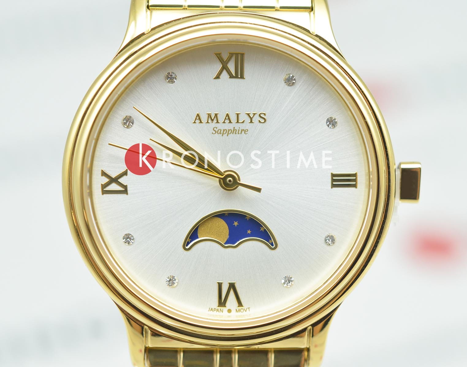 Amalys AMW-204 — женская модель с элегантным классическим стилем и утончёнными деталями. Круглый корпус изготовлен из нержавеющей стали с PVDPVDУльтратонкое покрытие наносится в технике вакуумного напыления, сочетает в себе нитрид титана особой прочности со слоем золота или оксида хрома. Несёт в себе декоративную или защитную функцию.-покрытием золотистого оттенка и гармонирует с браслетом в том же исполнении, состоящим из звеньев и обеспечивающим комфортное прилегание к запястью. Защитную функцию выполняет сапфировое стеклоСапфировое стеклоПрочный и надёжный материал из кристалла сапфира синтетического происхождения, характеризующийся особой твёрдостью и устойчивостью к царапинам и повреждениям., которое отличается стойкостью к царапинам и сохраняет высокую прозрачность. В основе лежит кварцевый механизм, гарантирующий точность хода и простоту эксплуатации. Циферблат украшен изящными римскими цифрами и метками, дополнен утончённым индикатором фаз Луны, который придаёт часам особый шарм и делает их акцентной деталью образа. Водозащита 3 ATM защищает от случайных брызг и дождя. Модель сочетает функциональность и изысканность, подойдёт как для повседневного стиля, так и для особых случаев.