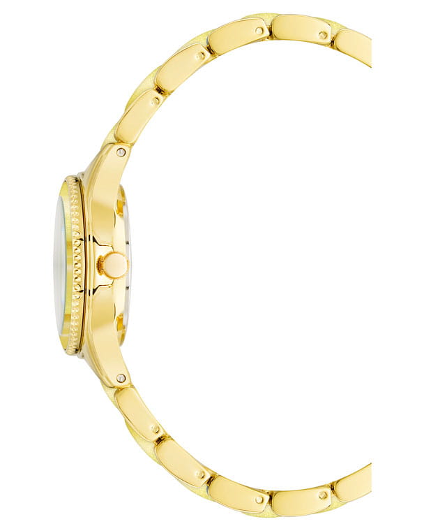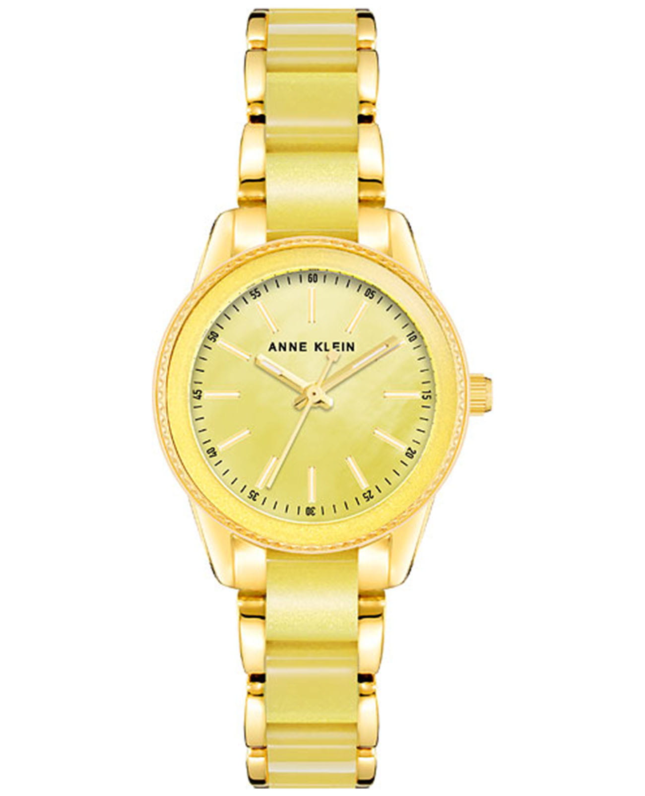 Женские кварцевые часы Anne Klein 3212YLGB представляют собой элегантный аксессуар с корпусом из нержавеющей стали с PVDPVDУльтратонкое покрытие наносится в технике вакуумного напыления, сочетает в себе нитрид титана особой прочности со слоем золота или оксида хрома. Несёт в себе декоративную или защитную функцию.-покрытием в золотистом оттенке диаметром 30 мм. Модель оснащена круглым желтым циферблатом нежно-желтого цвета с позолоченными стрелками с люминесцентным покрытиемЛюминесцентное покрытиеПозволяет считывать показания времени в темноте. Производители наносят на стрелки, часовые индексы, безель или поверхность циферблата светонакопительный состав, дающий холодное свечение. для отличной читаемости в любое время суток и часовыми метками, кварцевым механизмом японского производства с точностью хода ±20 секунд в месяц. Защитное минеральное стеклоМинеральное стеклоМинеральное стекло представляет собой искусственно выращенный минерал кварца. Такое стекло отличается особой устойчивостью к повреждениям и царапинам. Уступает по некоторым качествам сапфировому стеклу. устойчиво к царапинам, а водонепроницаемость 30 метров (3 атм) обеспечивает защиту от брызг и дождя. Браслет из нержавеющей стали с PVDPVDУльтратонкое покрытие наносится в технике вакуумного напыления, сочетает в себе нитрид титана особой прочности со слоем золота или оксида хрома. Несёт в себе декоративную или защитную функцию.-покрытием дополнен элегантными желтыми пластиковыми вставками.