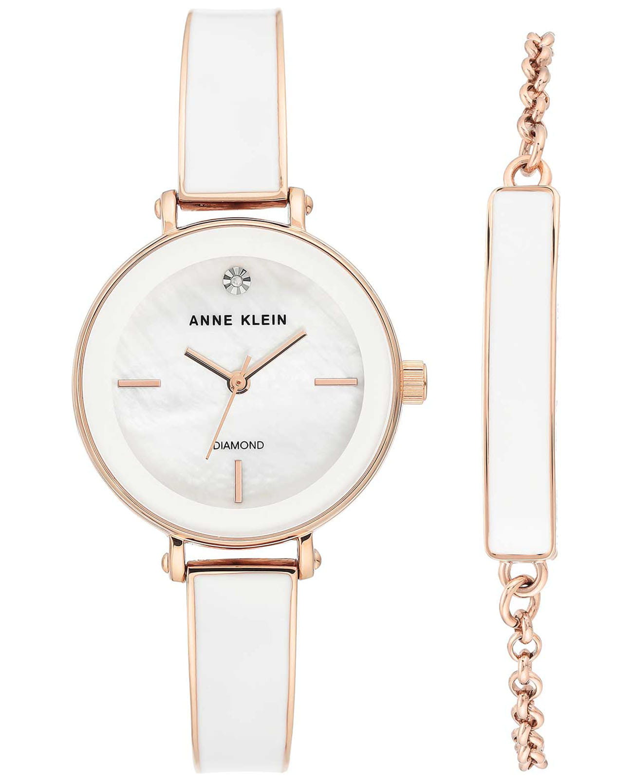 Женские кварцевые часы Anne Klein 3620BKST из серии Box Set сочетают элегантность и функциональность. Модель представлена круглым корпусом диаметром 30 мм из нержавеющей стали с PVDPVDУльтратонкое покрытие наносится в технике вакуумного напыления, сочетает в себе нитрид титана особой прочности со слоем золота или оксида хрома. Несёт в себе декоративную или защитную функцию.-покрытием в оттенке розового золота, дополненным белым циферблатом, украшенным бриллиантом на отметке 12 часов. Часы оснащены кварцевым механизмом с центральными часовой, минутной и секундной стрелками, обеспечивающим точность хода в пределах -10/+20 секунд в месяц. Ударопрочное минеральное стеклоМинеральное стеклоМинеральное стекло представляет собой искусственно выращенный минерал кварца. Такое стекло отличается особой устойчивостью к повреждениям и царапинам. Уступает по некоторым качествам сапфировому стеклу. защищает циферблат от царапин, а водонепроницаемость 3 ATM (30 метров) позволяет не снимать часы при мытье рук или под дождем. Металлический браслет с PVDPVDУльтратонкое покрытие наносится в технике вакуумного напыления, сочетает в себе нитрид титана особой прочности со слоем золота или оксида хрома. Несёт в себе декоративную или защитную функцию.-покрытием в цвете розового золота застегивается на ювелирную застежку для удобной фиксации. Часы подчеркивают статусность и идеально дополняют как повседневные, так и вечерние образы. В комплектацию входит браслет.