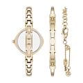 Женские кварцевые часы Anne Klein Box Set 5228GPST представляют собой элегантный аксессуар с круглым корпусом 29 мм из стали с IP-покрытиемIP-покрытиеМетод ионного напыления. Демонстрирует повышенную устойчивость к истиранию, окислению и химическим веществам. Под воздействием высокого давления и температуры около 1500°C молекулы металла надёжно соединяются с частицами корпуса часов. цвета желтого золота и обрамленный кристаллами. Модель оснащена кварцевым механизмом с точностью хода ±20 секунд в месяц. Циферблат с позолоченными стрелками защищен минеральным стекломМинеральное стеклоМинеральное стекло представляет собой искусственно выращенный минерал кварца. Такое стекло отличается особой устойчивостью к повреждениям и царапинам. Уступает по некоторым качествам сапфировому стеклу., устойчивым к царапинам. Водонепроницаемость 30 метров (3 атм) обеспечивает защиту от брызг и дождя. Изысканный браслет из нержавеющей стали с IP-покрытиемIP-покрытиеМетод ионного напыления. Демонстрирует повышенную устойчивость к истиранию, окислению и химическим веществам. Под воздействием высокого давления и температуры около 1500°C молекулы металла надёжно соединяются с частицами корпуса часов. так же обрамленный кристаллами, гармонично сочетается с корпусом, создавая целостный образ. Часы отличаются утонченным профилем и комфортной посадкой на запястье. Прилагается два дополнительных браслета.