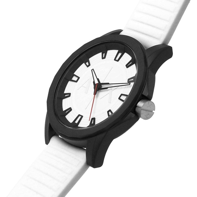 Мужские наручные часы с минеральным стекломМинеральное стеклоМинеральное стекло представляет собой искусственно выращенный минерал кварца. Такое стекло отличается особой устойчивостью к повреждениям и царапинам. Уступает по некоторым качествам сапфировому стеклу. Armani Exchange Outer Banks AX2523, кварцевый механизм с высокой точностью. Класс водозащиты: 30 метров, позволит защитить корпус от случайных брызг или капель дождя. Корпус часов изготовлен из пластика. Метки в виде штрихов. Заводная головка с защитой. Силиконовый ремешок с классической застежкой.