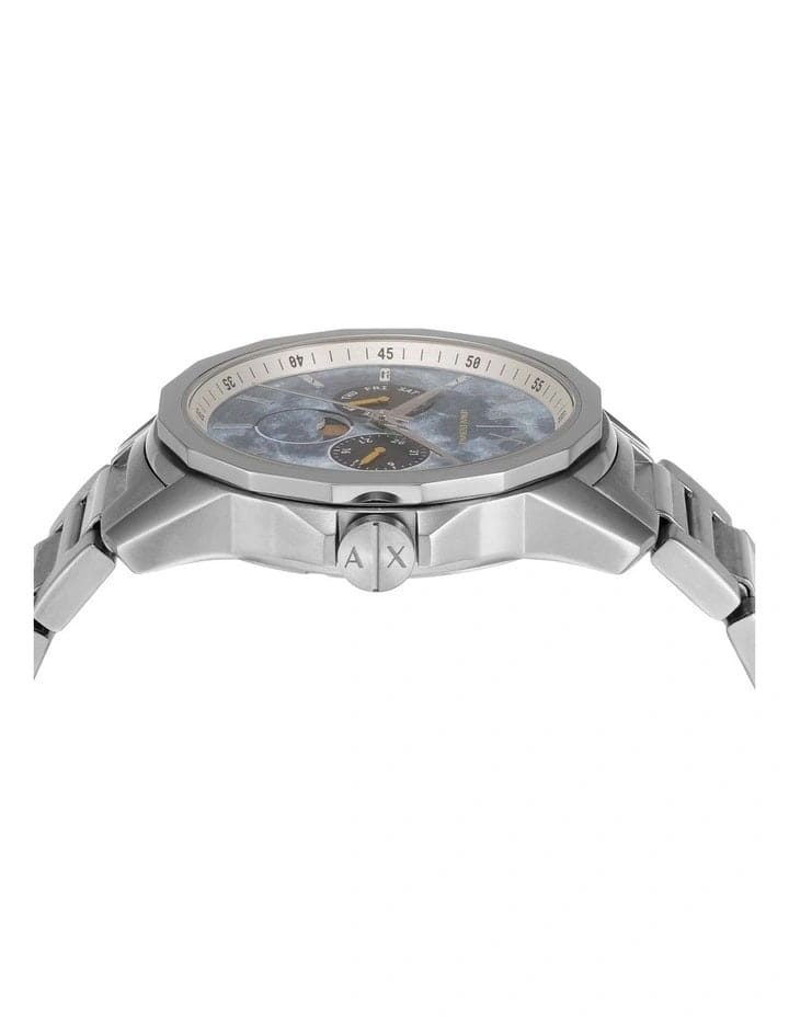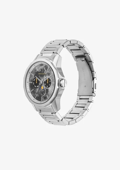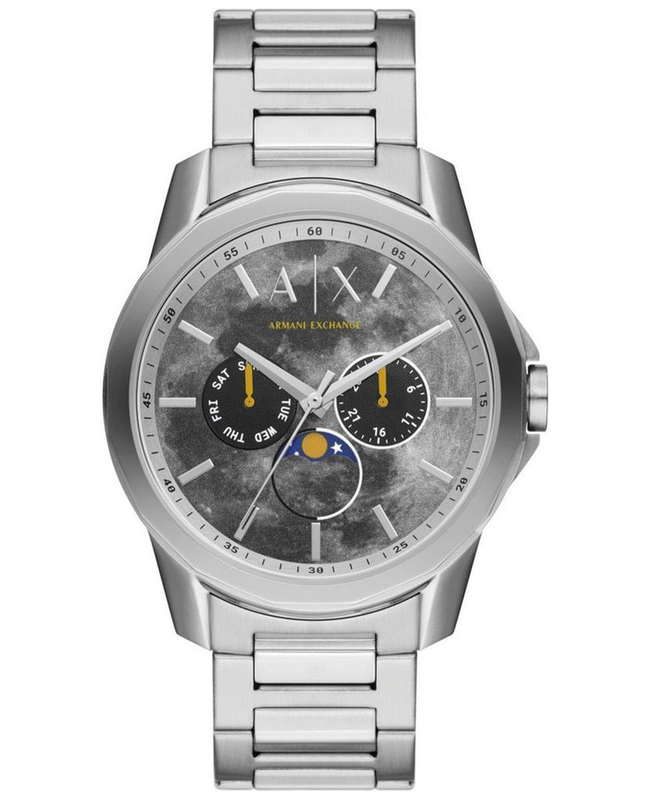 Мужские наручные часы с минеральным стекломМинеральное стеклоМинеральное стекло представляет собой искусственно выращенный минерал кварца. Такое стекло отличается особой устойчивостью к повреждениям и царапинам. Уступает по некоторым качествам сапфировому стеклу. Armani Exchange Banks AX1736, кварцевый механизм с высокой точностью. Класс водозащиты: 50 метров, позволит защитить корпус от случайных брызг или капель дождя. Корпус часов изготовлен из стали. Модель имеет серый циферблат с эффектом луны, серебряные часовую, минутную и секундную стрелки. Циферблат оснащен серебряными индексами в виде жезлов, а также дополнительными циферблатами фаз Луны, дня недели и даты. Стальной браслет на раскладной застёжкеРаскладная застёжкаТакой тип застёжки используется только на браслетах из металла. Она никогда не раскрывается полностью, происходит разделение на 2 и более частей. Раскладывающая застёжка снизит вероятность потери часов к минимуму..