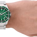 Мужские наручные часы хронографХронографФункция позволяет измерять отрезки времени с особой точностью: часы, минуты, секунды. Верным признаком хронографа является наличие на циферблате 3 дополнительных окошек-счётчиков. с минеральным стекломМинеральное стеклоМинеральное стекло представляет собой искусственно выращенный минерал кварца. Такое стекло отличается особой устойчивостью к повреждениям и царапинам. Уступает по некоторым качествам сапфировому стеклу. Armani Exchange Dante AX1957, кварцевый механизм с высокой точностью. Класс водозащиты: 100 метров, позволит плавать, нырять и заниматься другими водными видами спорта. Корпус часов изготовлен из нержавеющей стали. Стальной браслет на раскладной застёжкеРаскладная застёжкаТакой тип застёжки используется только на браслетах из металла. Она никогда не раскрывается полностью, происходит разделение на 2 и более частей. Раскладывающая застёжка снизит вероятность потери часов к минимуму.. Вращающийся безельБезельВнешний ободок, закрепляющий стекло. В спортивных часах так называется поворотное кольцо с делениями на циферблате, выполняет роль таймера – замеряет отрезки времени на шкале. Неподвижный безель – элемент декора. Однонаправленно вращающийся безель на дайверских часах позволяет фиксировать моменты погружения и выныривания на поверхность.. Текстурированный циферблат с метками в виде штрихов.