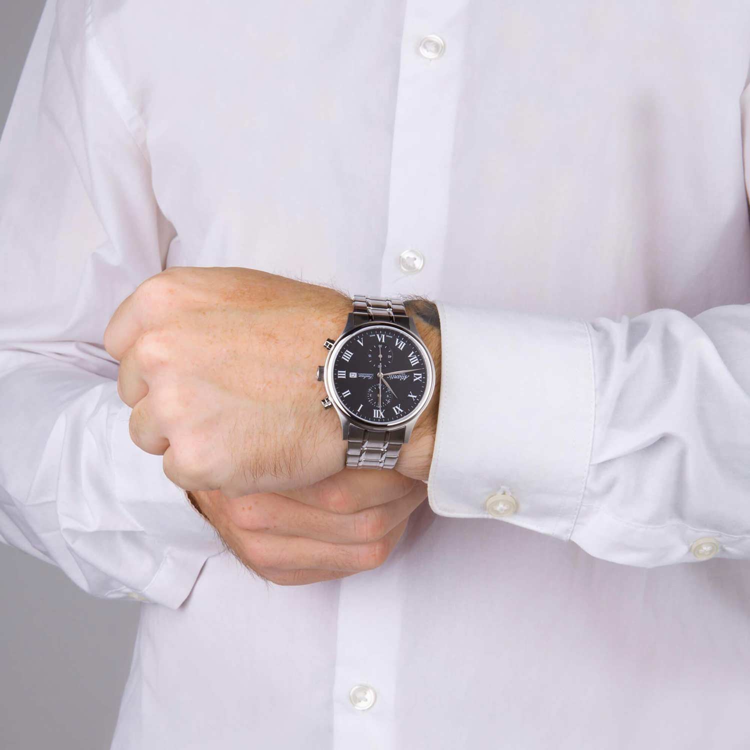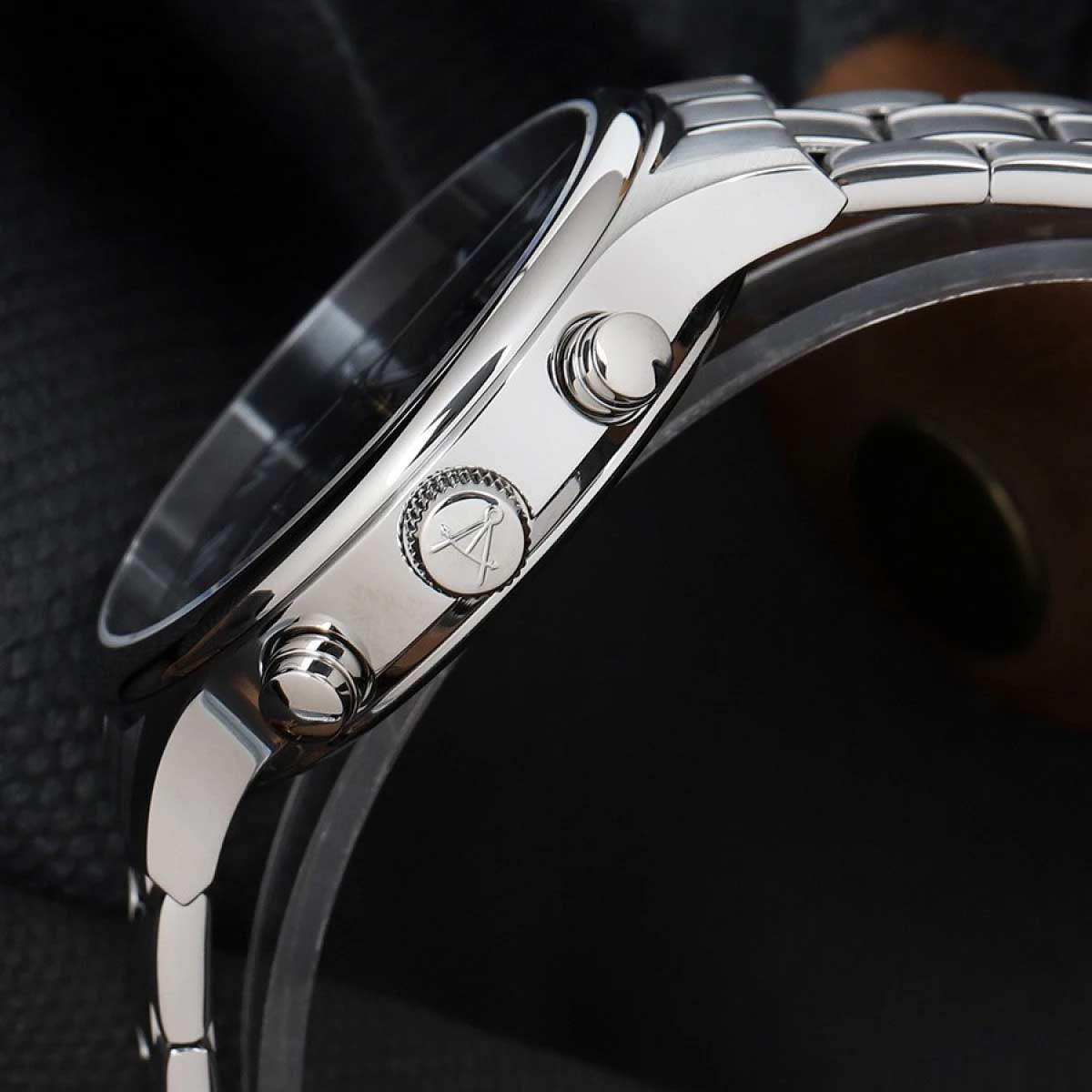 Мужские швейцарские часы-хронографХронографФункция позволяет измерять отрезки времени с особой точностью: часы, минуты, секунды. Верным признаком хронографа является наличие на циферблате 3 дополнительных окошек-счётчиков. с секундомеромСекундомерСекундоме́р — прибор, способный измерять интервалы времени с точностью до долей секунды. Atlantic Seabase 64457.41.68, кварцевый механизм с высокой точностью. Cапфировое стеклоСапфировое стеклоПрочный и надёжный материал из кристалла сапфира синтетического происхождения, характеризующийся особой твёрдостью и устойчивостью к царапинам и повреждениям. устойчивое к появлению царапин и обладающее высокой прозрачностью. Корпус и браслет часов изготовлены из нержавеющей стали. На циферблате расположены римские цифры, два дополнительных индикатора, окошко даты в положении 3 часов. Класс водозащиты: 50 метров, позволит защитить корпус от случайных брызг или капель дождя. Стальной браслет на раскладной застёжкеРаскладная застёжкаТакой тип застёжки используется только на браслетах из металла. Она никогда не раскрывается полностью, происходит разделение на 2 и более частей. Раскладывающая застёжка снизит вероятность потери часов к минимуму..