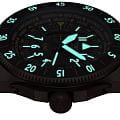 Циферблат отличается детальной функциональностью: в центре — крупные арабские цифры и стрелки, покрытые люминесцентным покрытиемЛюминесцентное покрытиеПозволяет считывать показания времени в темноте. Производители наносят на стрелки, часовые индексы, безель или поверхность циферблата светонакопительный состав, дающий холодное свечение., обеспечивающими мгновенное считывание времени даже в темноте. На «3 часах» — окошко даты, а индикатор второго часового пояса (GMT) удобно расположен на «9 часах». С внешней стороны — вращающийся безельБезельВнешний ободок, закрепляющий стекло. В спортивных часах так называется поворотное кольцо с делениями на циферблате, выполняет роль таймера – замеряет отрезки времени на шкале. Неподвижный безель – элемент декора. Однонаправленно вращающийся безель на дайверских часах позволяет фиксировать моменты погружения и выныривания на поверхность. с PVD-покрытиемPVDУльтратонкое покрытие наносится в технике вакуумного напыления, сочетает в себе нитрид титана особой прочности со слоем золота или оксида хрома. Несёт в себе декоративную или защитную функцию. с насечкой и градусной шкалой для секунд — идеален для расчёта времени пути или времени прибытия  .