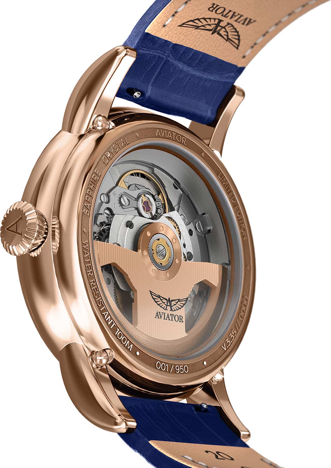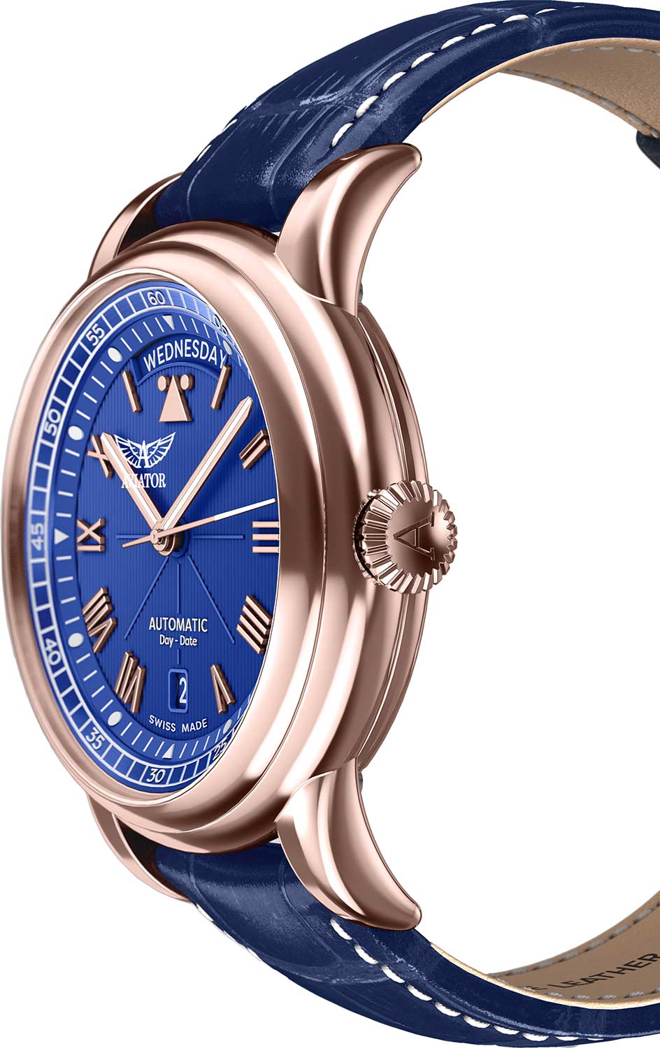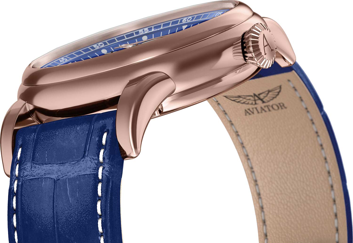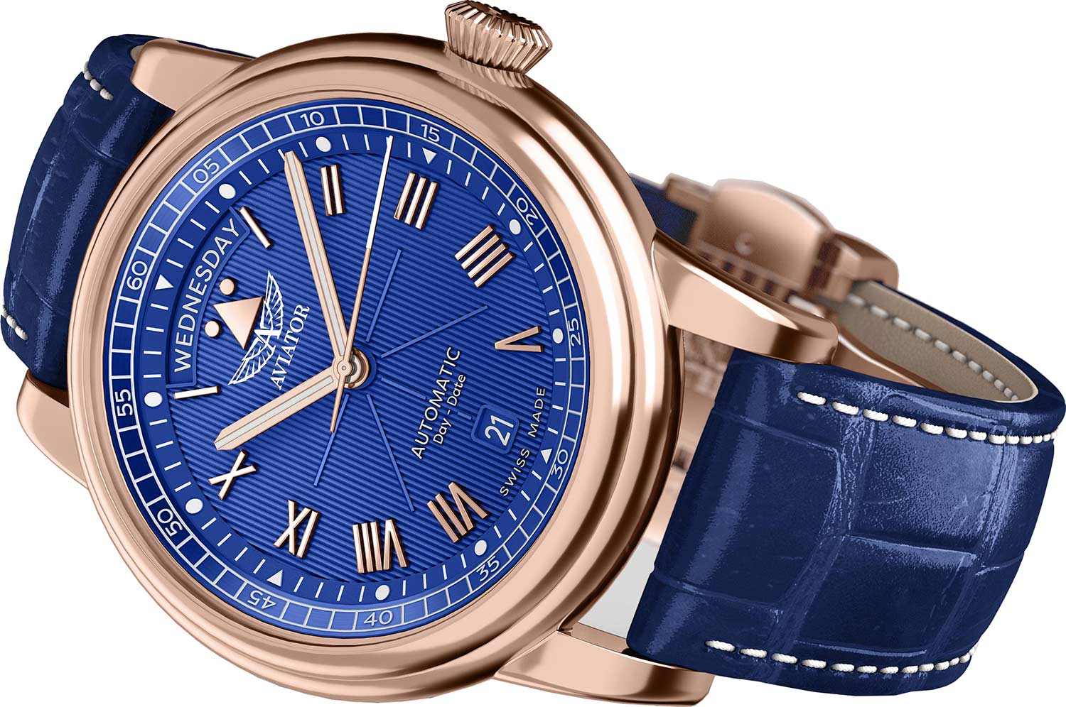 Aviator Douglas Day Date V.3.35.2.277.4 — швейцарские часы в классике авиадизайна, сочетающие безупречную читаемость и высокую надёжность. Лимитированная серия – 950 экземпляров. Корпус диаметром 41,2 мм выполнен из нержавеющей стали 316L с PVD-покрытиемPVDУльтратонкое покрытие наносится в технике вакуумного напыления, сочетает в себе нитрид титана особой прочности со слоем золота или оксида хрома. Несёт в себе декоративную или защитную функцию. цвета розового золота. Накладные метки выполнены в виде римских цифр. Окошко даты находится в положении 6 часов. День недели находится в положении 12 часов. Часовые метки и стрелки покрыты люминесцентным покрытиемЛюминесцентное покрытиеПозволяет считывать показания времени в темноте. Производители наносят на стрелки, часовые индексы, безель или поверхность циферблата светонакопительный состав, дающий холодное свечение. Superluminova, позволяющим легко определять время даже в тёмное время суток. Поверхность защищена прочным сапфировым стекломСапфировое стеклоПрочный и надёжный материал из кристалла сапфира синтетического происхождения, характеризующийся особой твёрдостью и устойчивостью к царапинам и повреждениям. с антибликовым покрытием, устойчивым к царапинам. Сердце модели — швейцарский механизм Sellita SW 240-1, известный своей точностью и долговечностью. Водозащита 100 метров, позволит плавать, нырять и заниматься другими водными видами спорта. Завинчивающаяся головка и задняя крышка обеспечивают уверенную ударопрочностьУдаропрочный корпусМеханизм заключён в корпус, выполненный из современных материалов, устойчивых к ударам, механическим повреждениям и падению с высоты: инновационный пластик, карбон, нержавеющая сталь, титан. и надёжную защиту от влаги и пыли. В механизме 26 камней, запас хода до 41 час. Модель дополнена кожаным ремешком с выразительной текстурой и классическим стилем, закреплённым с помощью застёжке-бабочке с кнопкамиЗастёжка "бабочка"Такой вид застёжки дополняется предохранителями, помогающими избежать случайного раскрытия браслета. Обладают изящным исполнением. — для максимального комфорта и лёгкости в повседневном использовании. Модель вдохновлена американским пассажирским самолетом Douglas DC-3, который является одним из лучших самолетов за всю историю авиации. Aviator — это образец лётной точности, инженерной чёткости и сдержанной роскоши, идеально подходящий для тех, кто ценит функциональность и уверенность в каждом элементе.