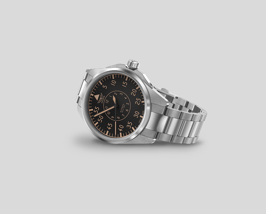 Aviator Airacobra 43 Heritage V.3.39.0.341.5 — швейцарские часы в классике авиадизайна, сочетающие безупречную читаемость и высокую надёжность. Корпус диаметром 42,8 мм выполнен из нержавеющей стали 316L. Матовый циферблат с крупными арабскими цифрами, широкими стрелками и контрастной шкалой минут обеспечивает точную и быструю считываемость информации — как и положено настоящим пилотским часам. У отметки «3 часа» — окошко даты. Часовые метки и стрелки покрыты люминесцентным покрытиемЛюминесцентное покрытиеПозволяет считывать показания времени в темноте. Производители наносят на стрелки, часовые индексы, безель или поверхность циферблата светонакопительный состав, дающий холодное свечение. Superluminova, позволяющим легко определять время даже в тёмное время суток. Поверхность защищена прочным сапфировым стекломСапфировое стеклоПрочный и надёжный материал из кристалла сапфира синтетического происхождения, характеризующийся особой твёрдостью и устойчивостью к царапинам и повреждениям. с антибликовым покрытиемАнтибликовое покрытиеСлой оксида металла в 0,13-0,3 микрон, благодаря которому стекло часов не бликует и не отражает свет. Антибликовое покрытие уменьшает отражение света в 10 раз, обеспечивая отличную читаемость показателей циферблата., устойчивым к царапинам. Сердце модели — швейцарский механизм Sellita SW 200-1, известный своей точностью и долговечностью. Водозащита 100 метров, позволит плавать, нырять и заниматься другими водными видами спорта.В механизме 26 камней, запас хода до 38 часов. Модель дополнена стальным браслетом, закреплённым с помощью раскладной застёжкиРаскладная застёжкаТакой тип застёжки используется только на браслетах из металла. Она никогда не раскрывается полностью, происходит разделение на 2 и более частей. Раскладывающая застёжка снизит вероятность потери часов к минимуму. — для максимального комфорта и лёгкости в повседневном использовании. Aviator — это образец лётной точности, инженерной чёткости и сдержанной роскоши, идеально подходящий для тех, кто ценит функциональность и уверенность в каждом элементе. Лимитированная серия.
