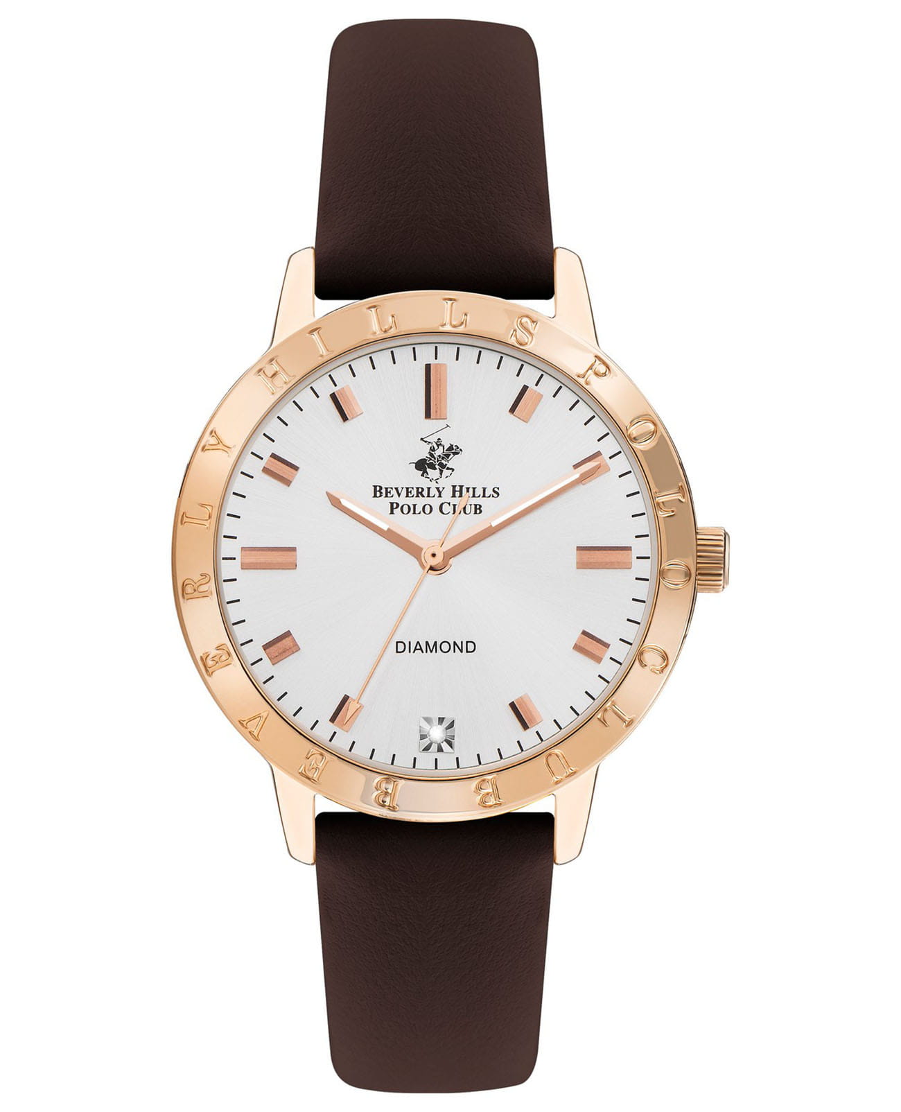 Американские женские часы с минеральным стекломМинеральное стеклоМинеральное стекло представляет собой искусственно выращенный минерал кварца. Такое стекло отличается особой устойчивостью к повреждениям и царапинам. Уступает по некоторым качествам сапфировому стеклу. Beverly Hills Polo Club BP3387C.422, кварцевый механизм с высокой точностью. Корпус часов изготовлен из нержавеющей стали с IP-покрытиемIP-покрытиеМетод ионного напыления. Демонстрирует повышенную устойчивость к истиранию, окислению и химическим веществам. Под воздействием высокого давления и температуры около 1500°C молекулы металла надёжно соединяются с частицами корпуса часов.. На неподвижном безелеБезельВнешний ободок, закрепляющий стекло. В спортивных часах так называется поворотное кольцо с делениями на циферблате, выполняет роль таймера – замеряет отрезки времени на шкале. Неподвижный безель – элемент декора. Однонаправленно вращающийся безель на дайверских часах позволяет фиксировать моменты погружения и выныривания на поверхность. из нержавеющей стали с IP-покрытиемIP-покрытиеМетод ионного напыления. Демонстрирует повышенную устойчивость к истиранию, окислению и химическим веществам. Под воздействием высокого давления и температуры около 1500°C молекулы металла надёжно соединяются с частицами корпуса часов. указано название бренда. Стрелки с люминесцентной подсветкойЛюминесцентное покрытиеПозволяет считывать показания времени в темноте. Производители наносят на стрелки, часовые индексы, безель или поверхность циферблата светонакопительный состав, дающий холодное свечение.. Циферблат украшен кристаллом. Класс водозащиты: 50 метров, позволит защитить корпус от случайных брызг или капель дождя. Кожаный ремешок с классической застежкой.