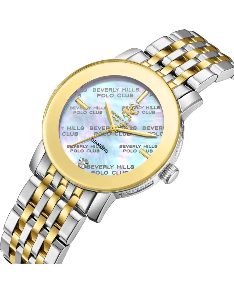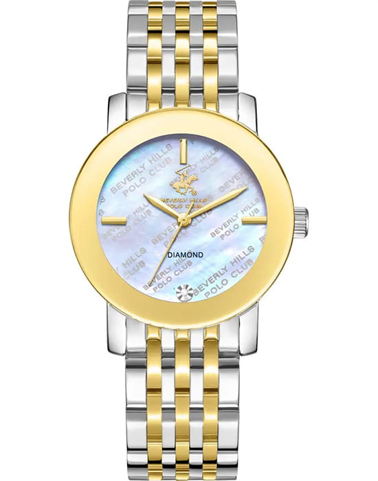 Часы Beverly Hills Polo Club BP3670C.220 — это стильный женский аксессуар, сочетающий элегантный дизайн и функциональность. Корпус диаметром 32 мм выполнен из нержавеющей стали серебристого цвета, и БезельБезельВнешний ободок, закрепляющий стекло. В спортивных часах так называется поворотное кольцо с делениями на циферблате, выполняет роль таймера – замеряет отрезки времени на шкале. Неподвижный безель – элемент декора. Однонаправленно вращающийся безель на дайверских часах позволяет фиксировать моменты погружения и выныривания на поверхность. с PVD-покрытиемPVDУльтратонкое покрытие наносится в технике вакуумного напыления, сочетает в себе нитрид титана особой прочности со слоем золота или оксида хрома. Несёт в себе декоративную или защитную функцию., придающими часам утончённый вид. Перламутровый циферблат с изящными штрихами защищён минеральным стекломМинеральное стеклоМинеральное стекло представляет собой искусственно выращенный минерал кварца. Такое стекло отличается особой устойчивостью к повреждениям и царапинам. Уступает по некоторым качествам сапфировому стеклу., устойчивым к царапинам.