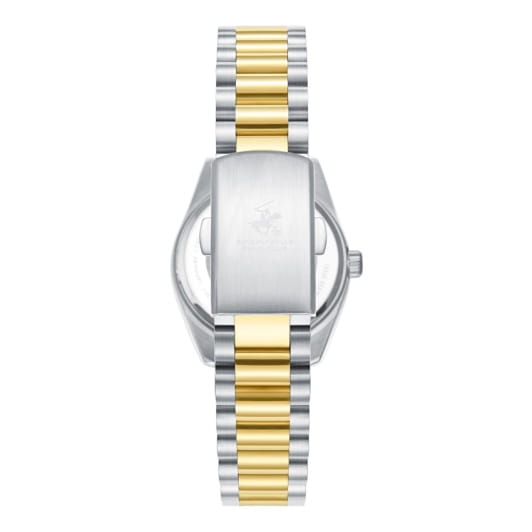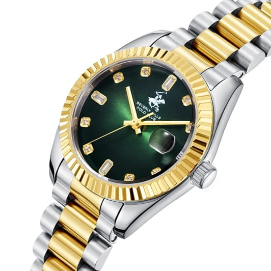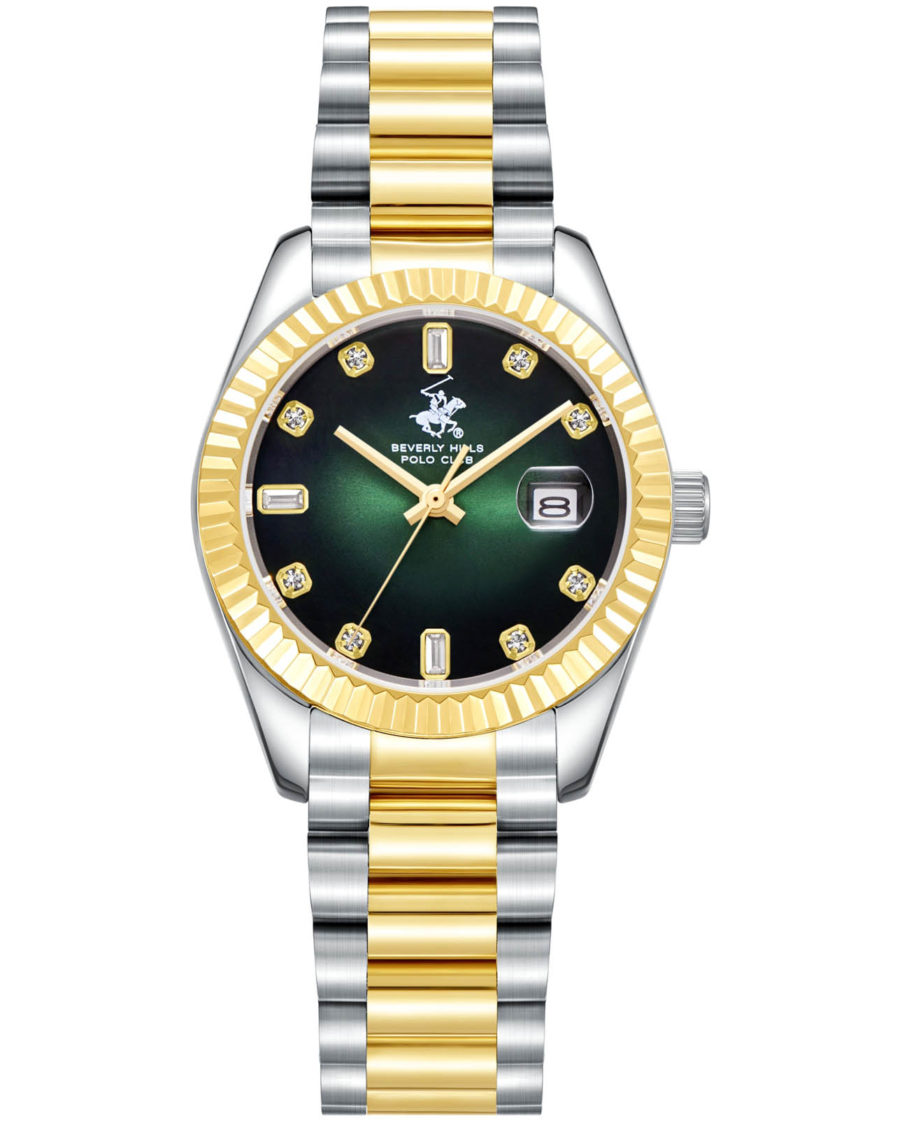 Американские женские часы Beverly Hills Polo Club BP3801X.270 - это стильный женский аксессуар, который сочетает элегантный дизайн и практичность. Корпус выполнен из нержавеющей стали серебристого цвета, диаметром 32 мм, что обеспечивает долговечность и утончённый внешний вид. Надежное минеральное стеклоМинеральное стеклоМинеральное стекло представляет собой искусственно выращенный минерал кварца. Такое стекло отличается особой устойчивостью к повреждениям и царапинам. Уступает по некоторым качествам сапфировому стеклу. с сапфировым покрытием защищает циферблат от царапин и обеспечивает долговечность. Неподвижный рифленый безельБезельВнешний ободок, закрепляющий стекло. В спортивных часах так называется поворотное кольцо с делениями на циферблате, выполняет роль таймера – замеряет отрезки времени на шкале. Неподвижный безель – элемент декора. Однонаправленно вращающийся безель на дайверских часах позволяет фиксировать моменты погружения и выныривания на поверхность. с IP-покрытиемIP-покрытиеМетод ионного напыления. Демонстрирует повышенную устойчивость к истиранию, окислению и химическим веществам. Под воздействием высокого давления и температуры около 1500°C молекулы металла надёжно соединяются с частицами корпуса часов. золотого цвета. Метки инкрустированы цирконами. Модель оснащена кварцевым механизмом, обеспечивающим высокую точность хода. Стальной браслет с частичным IP-покрытиемIP-покрытиеМетод ионного напыления. Демонстрирует повышенную устойчивость к истиранию, окислению и химическим веществам. Под воздействием высокого давления и температуры около 1500°C молекулы металла надёжно соединяются с частицами корпуса часов. на раскладной застёжкеРаскладная застёжкаТакой тип застёжки используется только на браслетах из металла. Она никогда не раскрывается полностью, происходит разделение на 2 и более частей. Раскладывающая застёжка снизит вероятность потери часов к минимуму. обеспечивает комфортное ношение. Водозащита 30 метров позволит защитить корпус от случайных брызг или капель дождя. Эта модель – отличный выбор для тех, кто ищет сочетание стиля, качества и функциональности. Часы станут не только полезным аксессуаром, но и выразительным элементом вашего имиджа.