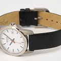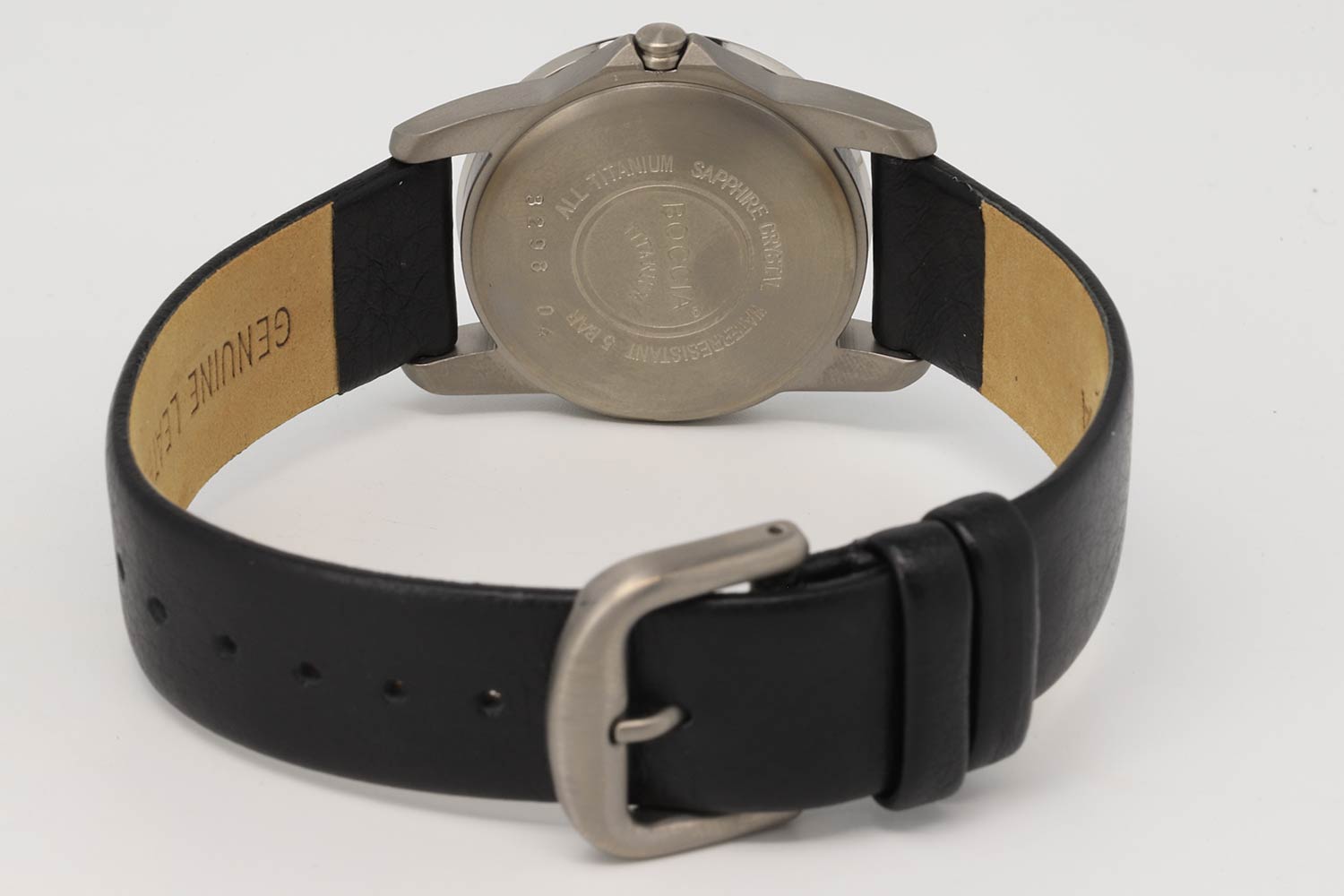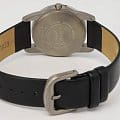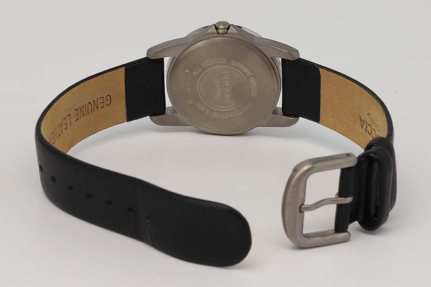 Корпус часов, выполненный из титана, обеспечивает лёгкость и прочность конструкции, а кожаный ремешок на стандартной застёжке придаёт часам стильный и элегантный вид.