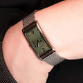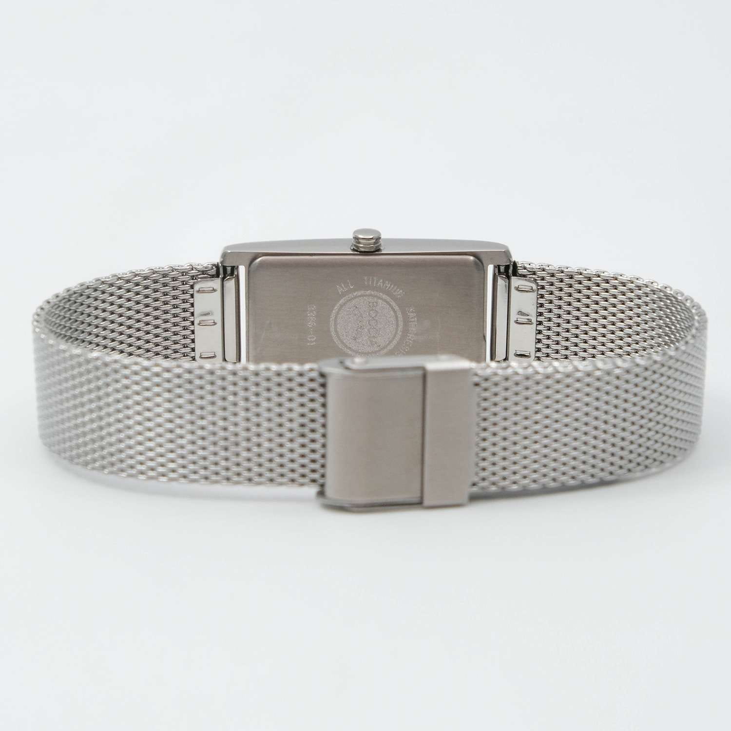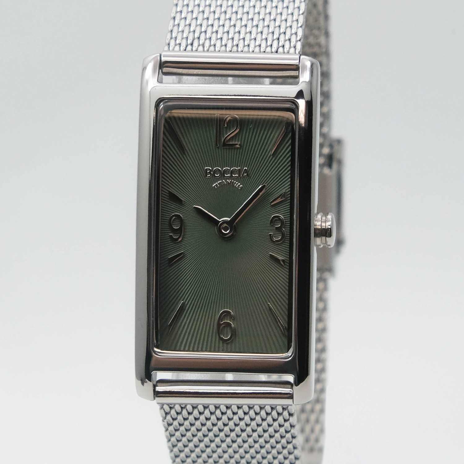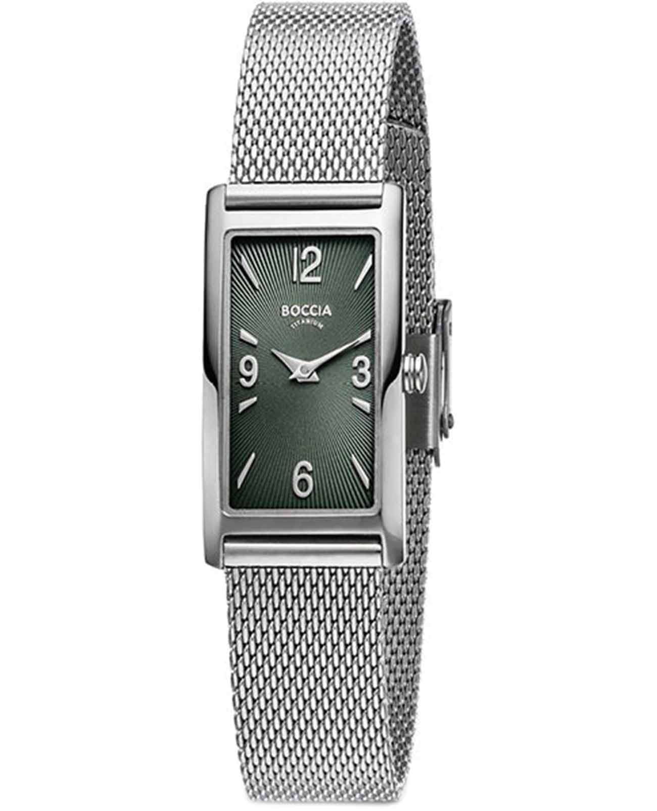 Женские часы Boccia 3366-01, которые станут стильным и функциональным аксессуаром для современной женщины. Эти часы оснащены кварцевым механизмом Miyota 5Y20, обеспечивающим точное и надежное отсчитывание времени. Центральные часовая и минутная стрелки выделяются на элегантном зеленом циферблате, создавая контрастный и выразительный образ. Прямоугольный корпус часов выполнен из суперлегкого титана, что делает их невероятно комфортными для ежедневного ношения. Размер корпуса 35х18 мм добавляет изысканности и утонченности внешнему виду. Особое внимание привлекает стальной браслет, выполненный в технике миланского плетения, который придаёт часам современный и элегантный вид. А раскладной замокРаскладной замокДанный вариант застежки используется только на часах с металлическим браслетом. Отличительная особенность такого крепления в том, что длина браслета становится универсальной и вы можете самостоятельно отрегулировать нужный вам размер – застежка просто двигается по браслету часов. обеспечивает удобство и надежность фиксации. Прочное выпуклое минеральное стеклоМинеральное стеклоМинеральное стекло представляет собой искусственно выращенный минерал кварца. Такое стекло отличается особой устойчивостью к повреждениям и царапинам. Уступает по некоторым качествам сапфировому стеклу. защищает циферблат от мелких механических повреждений, гарантируя долговечность и сохранение первоначального внешнего вида. Водостойкость уровня WR 30 обеспечивает защиту от брызг, делая их подходящими для повседневного использования.