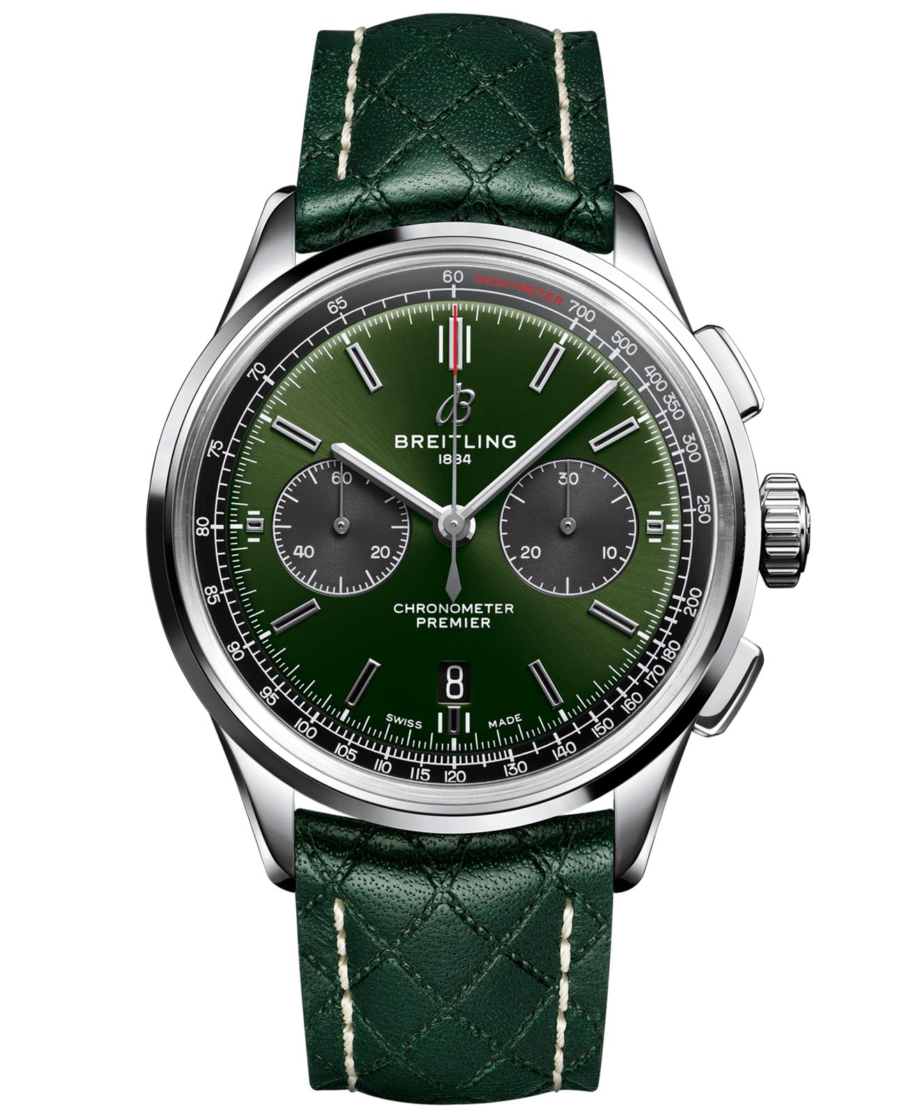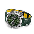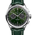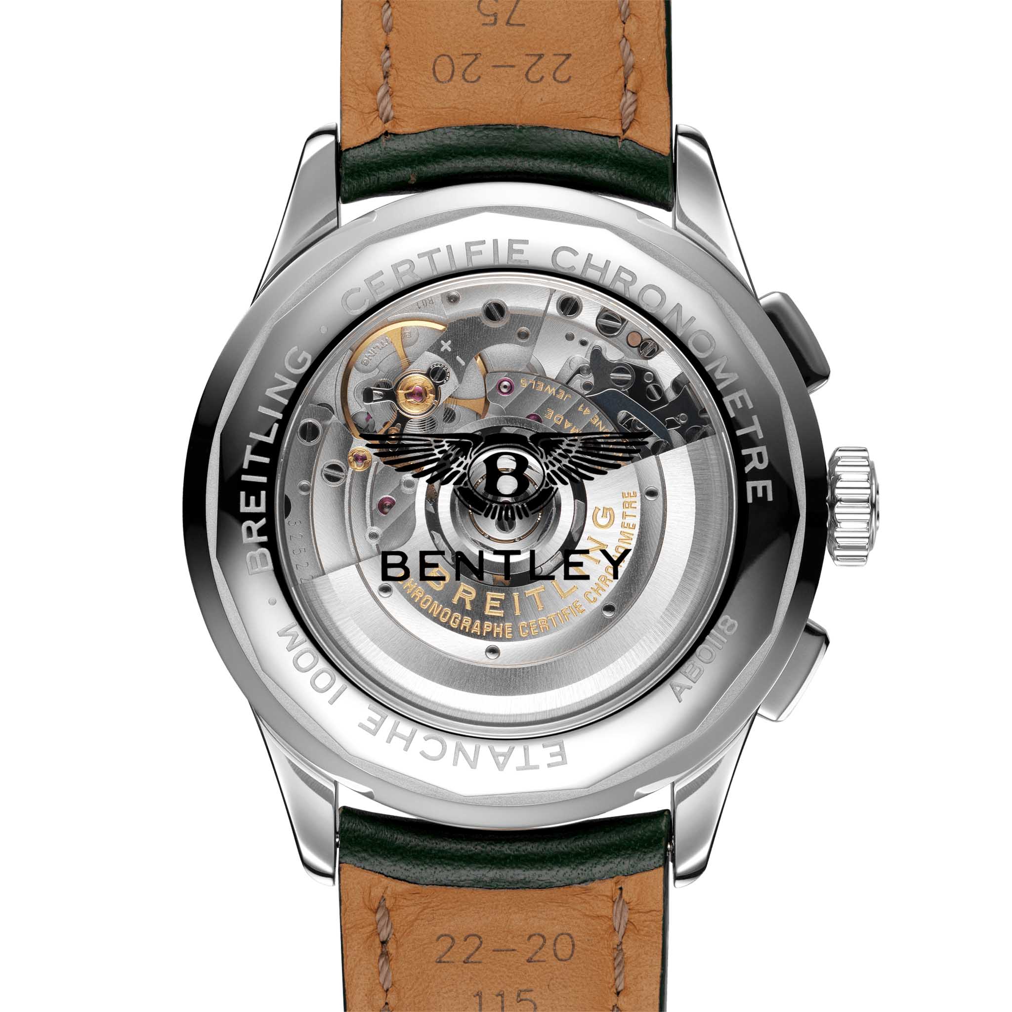 Модель Premier B01 Chronograph 42 – это результат уникального сотрудничества часовой мануфактуры Breitling и компании Bentley, ведущего производителя автомобилей класса люкс. Часы обладают корпусом из нержавеющей стали диаметром 42 мм. Малая секундная стрелка и 30-минутный счетчик хронографа выделяются на зеленом циферблате цвета British racing green, подчеркивая тот факт, что часы управляются механическим мануфактурным калибром. При этом на высококлассный сертифицированный механизм с автоподзаводом, Breitling Manufacture Caliber 01, предоставляется гарантия сроком пять лет. Рассмотреть его можно через прозрачное сапфировое стекло задней крышки корпуса.