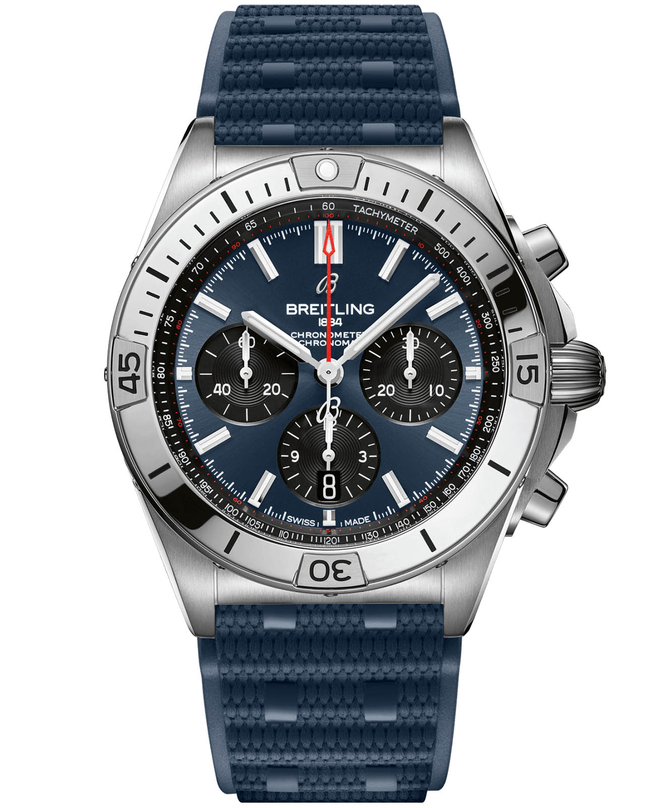Мужские швейцарские часы-хронограф с секундомером Breitling Chronomat B01 42 AB0134101C1S1, механический механизм (автоматический калибр) с высокой точностью. Сапфировое стеклоСапфировое стеклоПрочный и надёжный материал из кристалла сапфира синтетического происхождения, характеризующийся особой твёрдостью и устойчивостью к царапинам и повреждениям. устойчивое к появлению царапин, обладающее высокой прозрачностью. Класс водозащиты: 200 метров, позволит плавать, нырять и заниматься другими водными видами спорта. Корпус часов изготовлен из нержавеющей стали. Стрелки и метки с люминесцентным покрытиемЛюминесцентное покрытиеПозволяет считывать показания времени в темноте. Производители наносят на стрелки, часовые индексы, безель или поверхность циферблата светонакопительный состав, дающий холодное свечение.. Шкала тахиметра на циферблате. Окошко даты находится в положении 6 часов. Каучуковый ремешок на раскладной застёжкеРаскладная застёжкаТакой тип застёжки используется только на браслетах из металла. Она никогда не раскрывается полностью, происходит разделение на 2 и более частей. Раскладывающая застёжка снизит вероятность потери часов к минимуму..