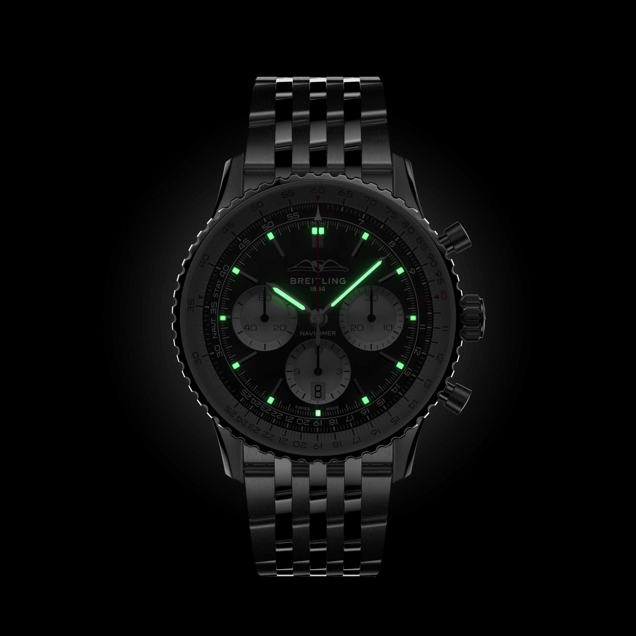 Мужские швейцарские часы-хронографХронографФункция позволяет измерять отрезки времени с особой точностью: часы, минуты, секунды. Верным признаком хронографа является наличие на циферблате 3 дополнительных окошек-счётчиков. с секундомеромСекундомерСекундоме́р — прибор, способный измерять интервалы времени с точностью до долей секунды. Breitling Navitimer B01 Chronograph 43 AB0138211B1A1, механический механизм (автоматический калибр) с высокой точностью. Сапфировое стеклоСапфировое стеклоПрочный и надёжный материал из кристалла сапфира синтетического происхождения, характеризующийся особой твёрдостью и устойчивостью к царапинам и повреждениям. с антибликовым покрытием устойчивое к появлению царапин, обладающее высокой прозрачностью. Класс водозащиты: 30 метров, позволит защитить корпус от случайных брызг или капель дождя. Корпус часов изготовлен из стали. Стальной браслет с застёжкой-бабочкой с кнопкамиЗастёжка "бабочка"Такой вид застёжки дополняется предохранителями, помогающими избежать случайного раскрытия браслета. Обладают изящным исполнением. . Шкала тахиметраТахиметрРазмеченная шкала, располагается на ободке или безеле часов. Тахиметр позволяет рассчитать скорость на определённом участке пути, расстояние измеряется в километрах или милях. на циферблате. Часы имеют сертификат COSCСертификат COSCОфициальный сертификат, подтверждающий то, что часы ходят с особо высокой точностью. Для получения документа часы подвергаются тестовым испытаниям, разработанным швейцарским институтом тестирования хронометров COSC. Допустимая норма для механических часов -4/+6 секунд в день, для кварцевых моделей +/- 0,07 секунд в день.. Окошко даты находится в положении 6 часов. Стрелки и метки с люминесцентным покрытиемЛюминесцентное покрытиеПозволяет считывать показания времени в темноте. Производители наносят на стрелки, часовые индексы, безель или поверхность циферблата светонакопительный состав, дающий холодное свечение..