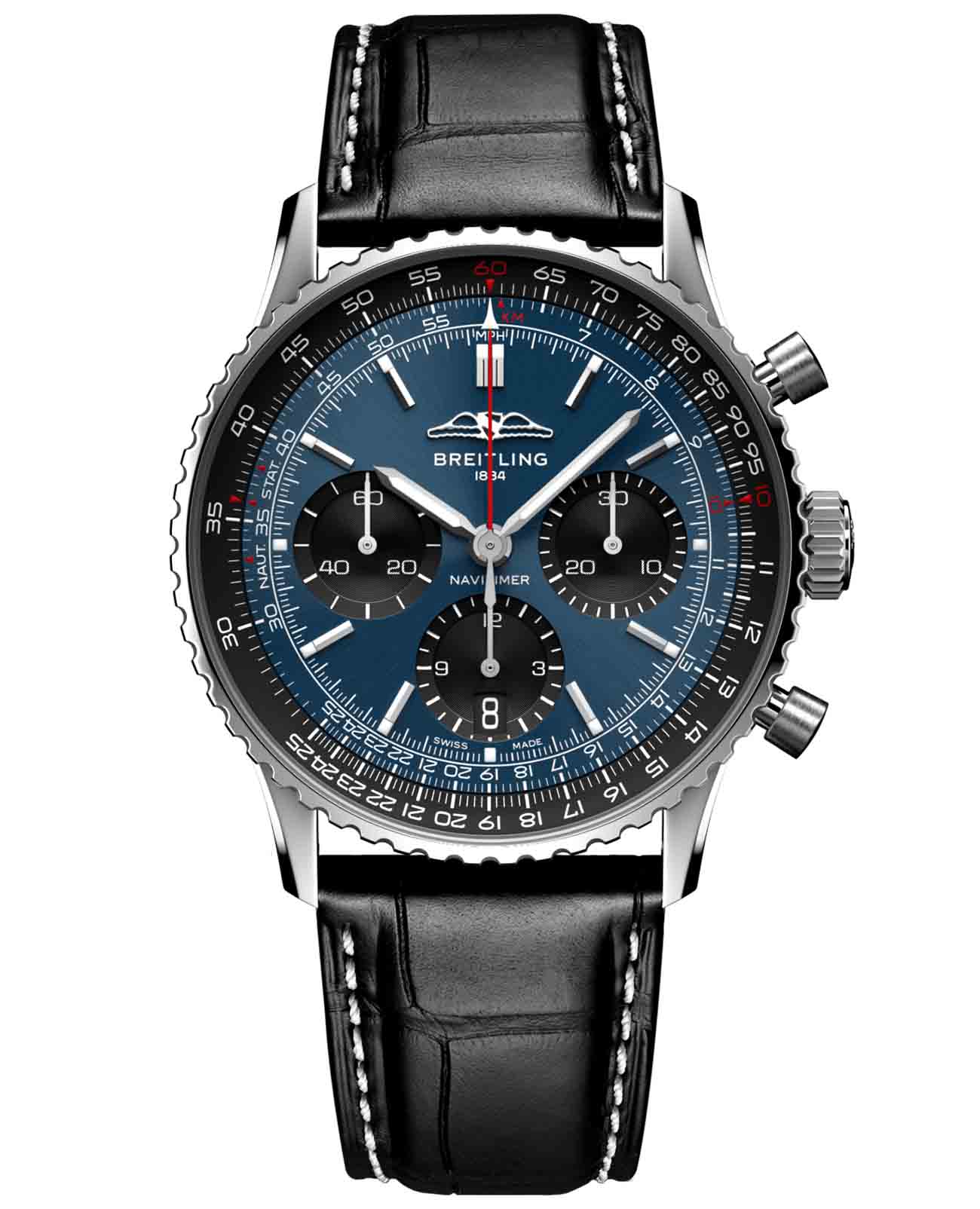 Мужские швейцарские часы-хронографХронографФункция позволяет измерять отрезки времени с особой точностью: часы, минуты, секунды. Верным признаком хронографа является наличие на циферблате 3 дополнительных окошек-счётчиков. с секундомеромСекундомерСекундоме́р — прибор, способный измерять интервалы времени с точностью до долей секунды. Breitling Navitimer B01 Chronograph 41 AB0139241C1P1, механический механизм (автоматический калибр) с высокой точностью. С момента своего дебюта 70 лет назад icon от Breitling претерпел множество модификаций, но этот новый Navitimer отражает его самые классические функции, дополняя их современными усовершенствованиями. Сплющенная логарифмическая линейка и выпуклый кристалл создают иллюзию более изящного профиля.  Сапфировое стеклоСапфировое стеклоПрочный и надёжный материал из кристалла сапфира синтетического происхождения, характеризующийся особой твёрдостью и устойчивостью к царапинам и повреждениям. устойчивое к появлению царапин, обладающее высокой прозрачностью. Класс водозащиты: 30 метров, позволит защитить корпус от случайных брызг или капель дождя. Корпус часов изготовлен из стали. Чередующиеся полированные и матовые металлические элементы создают блестящую, но в то же время сдержанную отделку. Кожаный ремешок с раскладной застёжкойРаскладная застёжкаТакой тип застёжки используется только на браслетах из металла. Она никогда не раскрывается полностью, происходит разделение на 2 и более частей. Раскладывающая застёжка снизит вероятность потери часов к минимуму.. Шкала тахиметраТахиметрРазмеченная шкала, располагается на ободке или безеле часов. Тахиметр позволяет рассчитать скорость на определённом участке пути, расстояние измеряется в километрах или милях. на циферблате. Часы имеют сертификат COSCСертификат COSCОфициальный сертификат, подтверждающий то, что часы ходят с особо высокой точностью. Для получения документа часы подвергаются тестовым испытаниям, разработанным швейцарским институтом тестирования хронометров COSC. Допустимая норма для механических часов -4/+6 секунд в день, для кварцевых моделей +/- 0,07 секунд в день.. Окошко даты находится в положении 6 часов. Стрелки и метки с люминесцентным покрытиемЛюминесцентное покрытиеПозволяет считывать показания времени в темноте. Производители наносят на стрелки, часовые индексы, безель или поверхность циферблата светонакопительный состав, дающий холодное свечение.. И если есть одно обновление, которое наверняка вызовет ностальгию, так это возвращение крыльев AOPA в исходное положение на 12 часов. Вот уже 70 лет оригинальные часы Breitling pilot в равной степени нравятся как авиаторам, так и ценителям вкуса. Это самые культовые часы Breitling, которые носят астронавты в космосе и крупнейшие звезды на земле, и одни из самых узнаваемых часов всех времен.