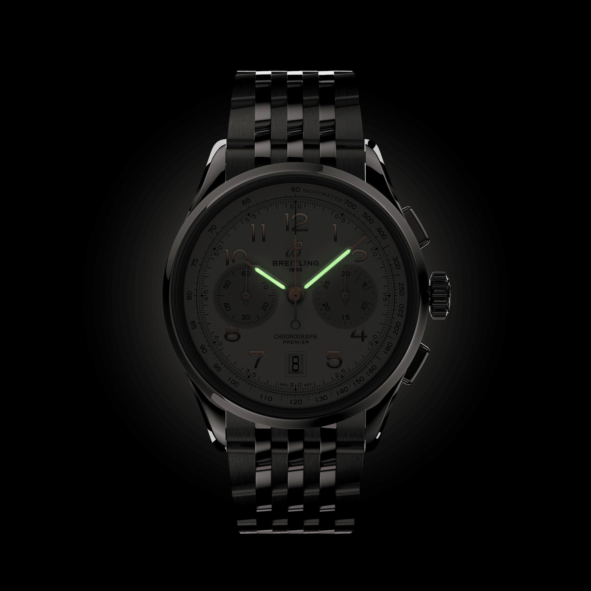 Мужские швейцарские часы-хронографХронографФункция позволяет измерять отрезки времени с особой точностью: часы, минуты, секунды. Верным признаком хронографа является наличие на циферблате 3 дополнительных окошек-счётчиков. с тахиметромТахиметрРазмеченная шкала, располагается на ободке или безеле часов. Тахиметр позволяет рассчитать скорость на определённом участке пути, расстояние измеряется в километрах или милях. Breitling Premier B01 Chronograph 42 AB0145211G1A1, механический механизм (автоматический калибр) с высокой точностью. Сапфировое стеклоСапфировое стеклоПрочный и надёжный материал из кристалла сапфира синтетического происхождения, характеризующийся особой твёрдостью и устойчивостью к царапинам и повреждениям. с антибликовым покрытием устойчивое к появлению царапин, обладающее высокой прозрачностью. Класс водозащиты: 100 метров, позволит плавать, нырять и заниматься другими водными видами спорта. Корпус часов изготовлен из стали. Стальной браслет с застёжкой-бабочкой с кнопкамиЗастёжка "бабочка"Такой вид застёжки дополняется предохранителями, помогающими избежать случайного раскрытия браслета. Обладают изящным исполнением. . Стрелки с люминесцентным покрытиемЛюминесцентное покрытиеПозволяет считывать показания времени в темноте. Производители наносят на стрелки, часовые индексы, безель или поверхность циферблата светонакопительный состав, дающий холодное свечение.. Окошко даты находится в положении 6 часов. СекундомерСекундомерСекундоме́р — прибор, способный измерять интервалы времени с точностью до долей секунды..