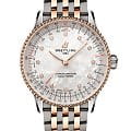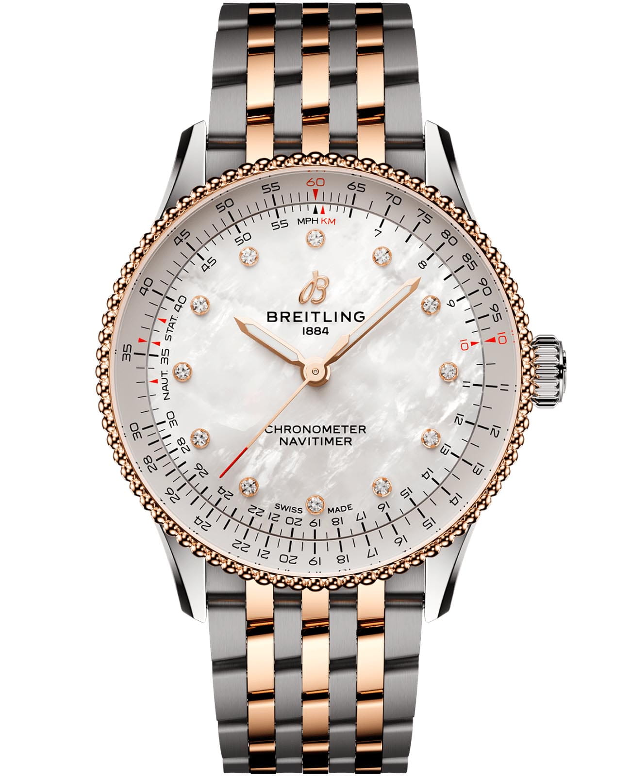 Швейцарские унисекс часы-хронометр Breitling Navitimer Automatic 36 U17327211A1U1, механический механизм (автоматический калибр) с высокой точностью. Сапфировое стеклоСапфировое стеклоПрочный и надёжный материал из кристалла сапфира синтетического происхождения, характеризующийся особой твёрдостью и устойчивостью к царапинам и повреждениям. устойчивое к появлению царапин, обладающее высокой прозрачностью. Класс водозащиты: 30 метров, позволит защитить корпус от случайных брызг или капель дождя. Корпус часов изготовлен из нержавеющей стали. Браслет из нержавеющей стали и красного 18-каратного золота18-каратное золотоОбозначение по каратной системе пробирования, оно показывает, сколько драгоценного металла содержится в изделии. 18 карат - в составе 75% чистого золота, соответствует 750 пробе.