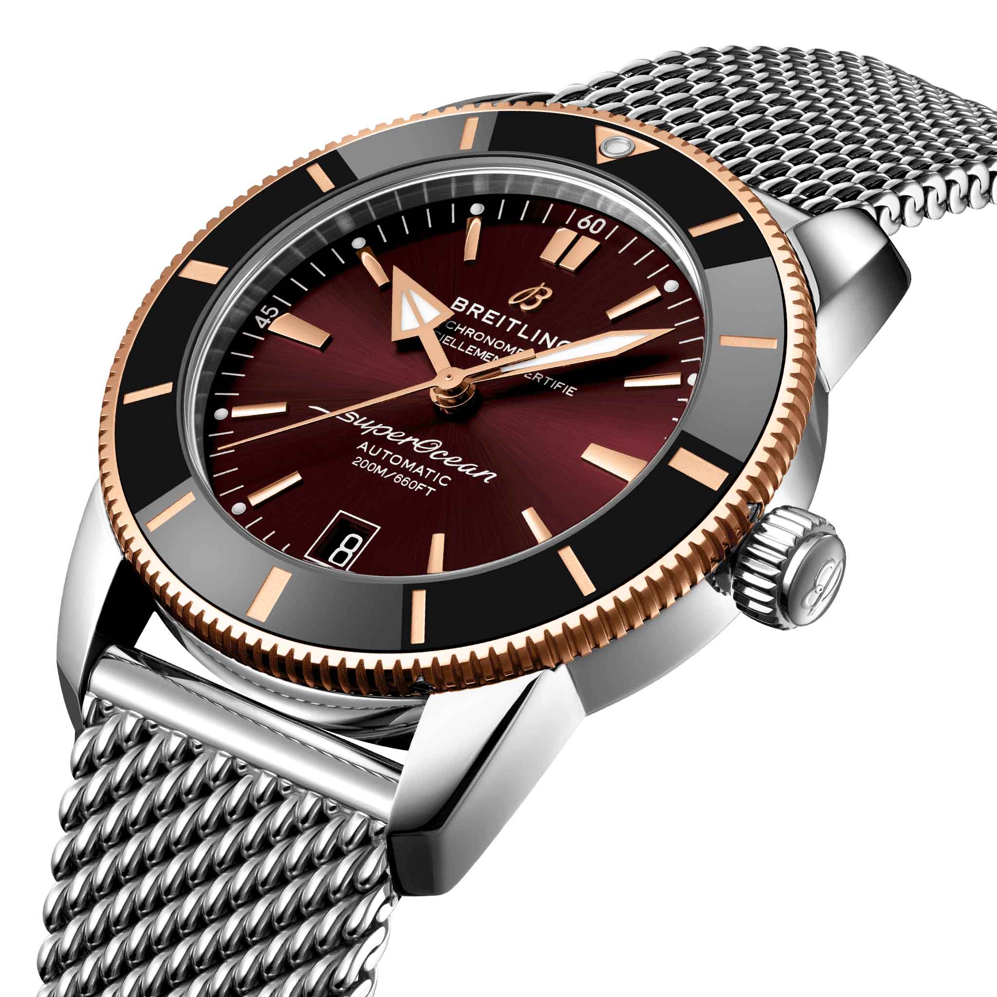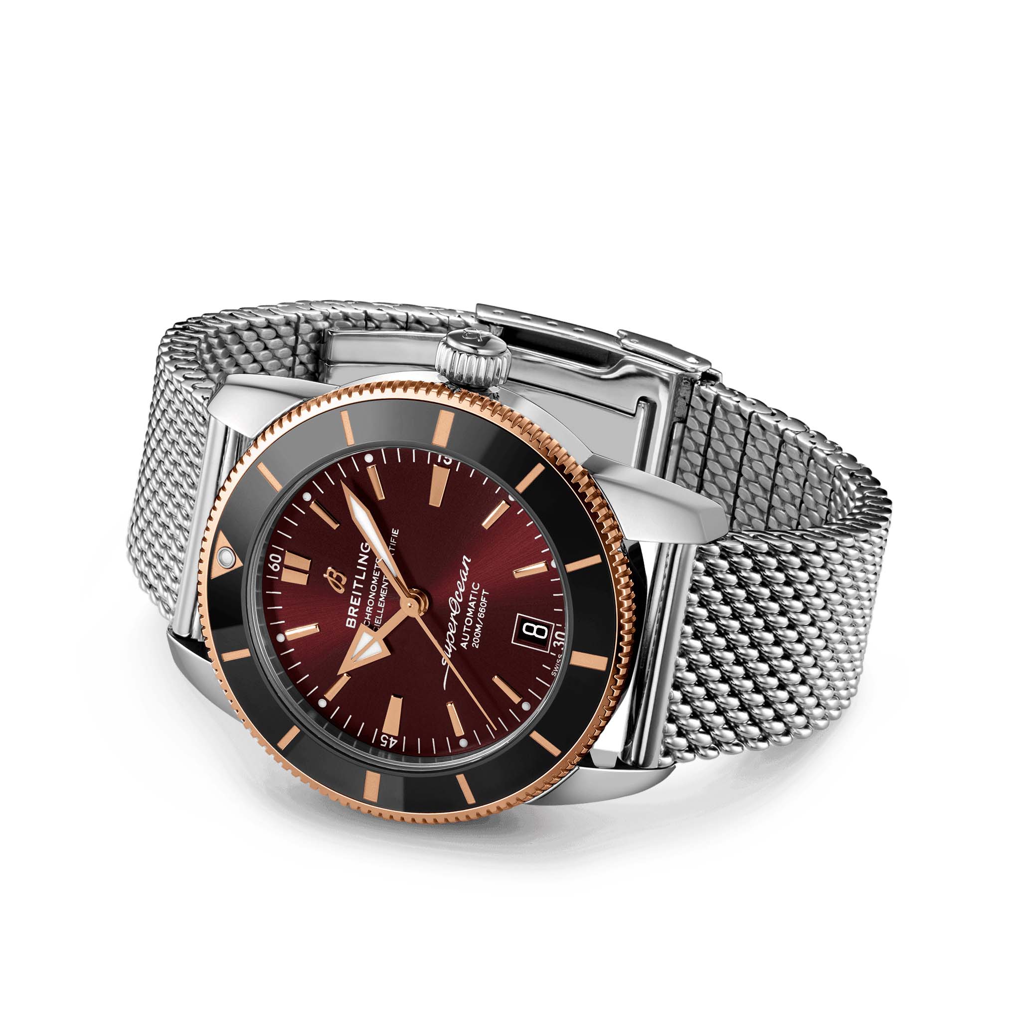 . Часы Superocean Heritage, оснащенные культовыми стрелками треугольной формы, а также однонаправленным безелемБезельВнешний ободок, закрепляющий стекло. В спортивных часах так называется поворотное кольцо с делениями на циферблате, выполняет роль таймера – замеряет отрезки времени на шкале. Неподвижный безель – элемент декора. Однонаправленно вращающийся безель на дайверских часах позволяет фиксировать моменты погружения и выныривания на поверхность. с полированным керамическим кольцом, представляют собой элегантные часы для дайверов. Часы Superocean Heritage оснащены калибром Breitling Manufacture B20, сертифицированным COSCСертификат COSCОфициальный сертификат, подтверждающий то, что часы ходят с особо высокой точностью. Для получения документа часы подвергаются тестовым испытаниям, разработанным швейцарским институтом тестирования хронометров COSC. Допустимая норма для механических часов -4/+6 секунд в день, для кварцевых моделей +/- 0,07 секунд в день. хронометром на базе Tudor Caliber MT5612.