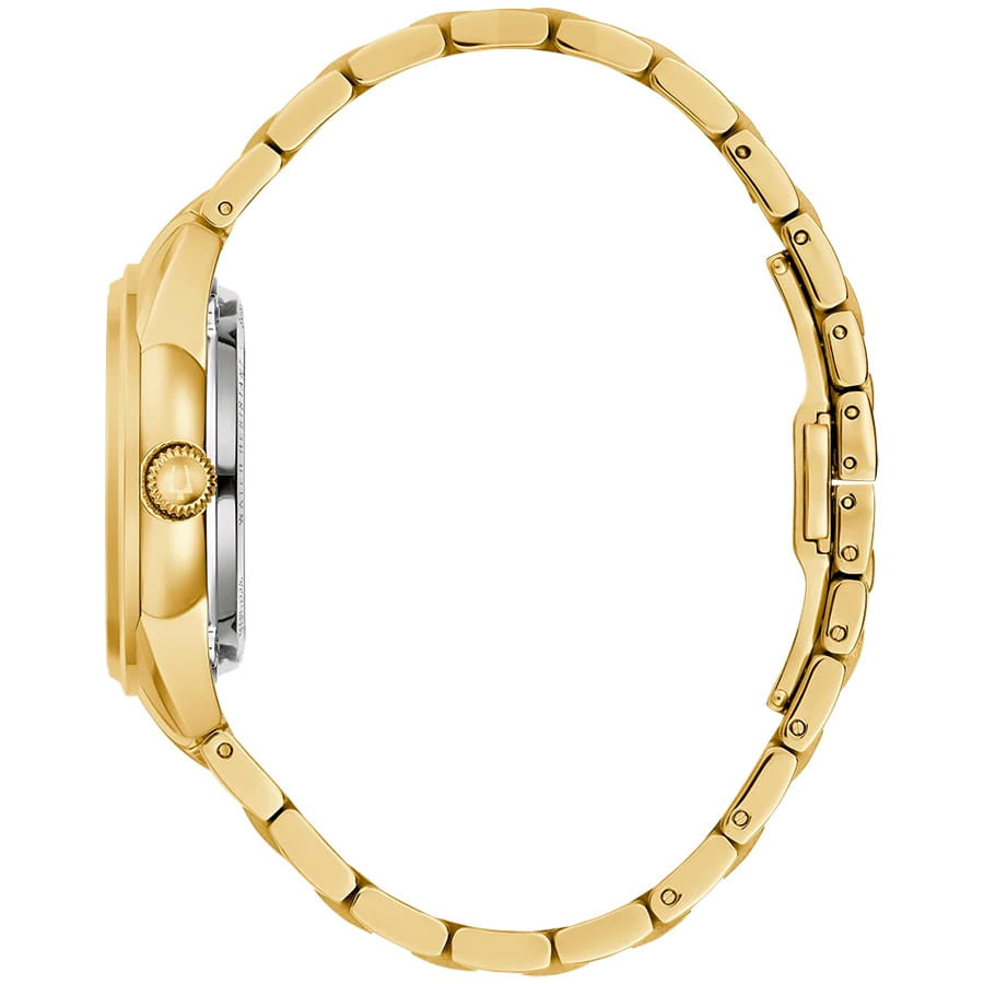 Женские кварцевые часы Bulova Automatic Ladies 97L172 – отражающий идеальное сочетание современного дизайна, надёжности и функциональности. Элегантный облик станет превосходным завершением образа, наделив его индивидуальным характером. Корпус из нержавеющей стали с IP-покрытиемIP-покрытиеМетод ионного напыления. Демонстрирует повышенную устойчивость к истиранию, окислению и химическим веществам. Под воздействием высокого давления и температуры около 1500°C молекулы металла надёжно соединяются с частицами корпуса часов. золотистого цвета, диаметром 35 мм идеально сбалансирован и элегантен. Защиту циферблата обеспечивает прочное сапфировое стеклоСапфировое стеклоПрочный и надёжный материал из кристалла сапфира синтетического происхождения, характеризующийся особой твёрдостью и устойчивостью к царапинам и повреждениям., гарантирующее четкость показаний. Циферблат из белого перламутра украшен золотистыми стрелками и метками, а также апертуром, открывающим вид на автоматический механизм. Браслет из нержавеющей стали с IP-покрытиемIP-покрытиеМетод ионного напыления. Демонстрирует повышенную устойчивость к истиранию, окислению и химическим веществам. Под воздействием высокого давления и температуры около 1500°C молекулы металла надёжно соединяются с частицами корпуса часов. на застёжке-бабочке с кнопкамиЗастёжка "бабочка"Такой вид застёжки дополняется предохранителями, помогающими избежать случайного раскрытия браслета. Обладают изящным исполнением. обеспечивает комфортное ношение. Водозащита 30 метров позволит защитить корпус от случайных брызг или капель дождя. Эта модель – отличный выбор для тех, кто ищет сочетание стиля, качества и функциональности. Часы станут не только полезным аксессуаром, но и выразительным элементом вашего имиджа.