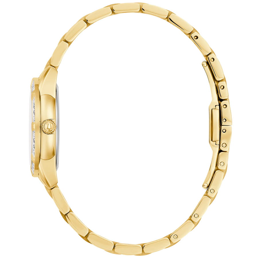 Женские кварцевые часы Bulova Sutton 98R297 – отражающий идеальное сочетание современного дизайна, надёжности и функциональности. Элегантный облик станет превосходным завершением образа, наделив его индивидуальным характером. Корпус из нержавеющей стали с IP-покрытиемIP-покрытиеМетод ионного напыления. Демонстрирует повышенную устойчивость к истиранию, окислению и химическим веществам. Под воздействием высокого давления и температуры около 1500°C молекулы металла надёжно соединяются с частицами корпуса часов. золотистого цвета, диаметром 28 мм идеально сбалансирован и элегантен. Сапфировое стеклоСапфировое стеклоПрочный и надёжный материал из кристалла сапфира синтетического происхождения, характеризующийся особой твёрдостью и устойчивостью к царапинам и повреждениям. защищает циферблат от царапин и устойчивое к механическим повреждениям. БезельБезельВнешний ободок, закрепляющий стекло. В спортивных часах так называется поворотное кольцо с делениями на циферблате, выполняет роль таймера – замеряет отрезки времени на шкале. Неподвижный безель – элемент декора. Однонаправленно вращающийся безель на дайверских часах позволяет фиксировать моменты погружения и выныривания на поверхность. украшен бриллиантами. Стальной браслет с IP-покрытиемIP-покрытиеМетод ионного напыления. Демонстрирует повышенную устойчивость к истиранию, окислению и химическим веществам. Под воздействием высокого давления и температуры около 1500°C молекулы металла надёжно соединяются с частицами корпуса часов. на застёжке-бабочке с кнопкамиЗастёжка "бабочка"Такой вид застёжки дополняется предохранителями, помогающими избежать случайного раскрытия браслета. Обладают изящным исполнением. обеспечивает комфортное ношение. Водозащита 30 метров позволит защитить корпус от случайных брызг или капель дождя. Эта модель – отличный выбор для тех, кто ищет сочетание стиля, качества и функциональности. Часы станут не только полезным аксессуаром, но и выразительным элементом вашего имиджа.