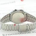 Серебристая цветовая гамма подойдёт к любой одежде, предоставляя простор для экспериментов. Цифровой дисплей в голубом цвете оснащён функцией подсветки, облегчающей считывание информации в темноте. Среди дополнительных возможностей числятся будильник, календарь, секундомер. Ударопрочный корпус сделан из полимерного пластика. Минеральное стекло отличается устойчивостью к появлению царапин. Габариты: 38,6 x 36,3 x 9,6 мм.