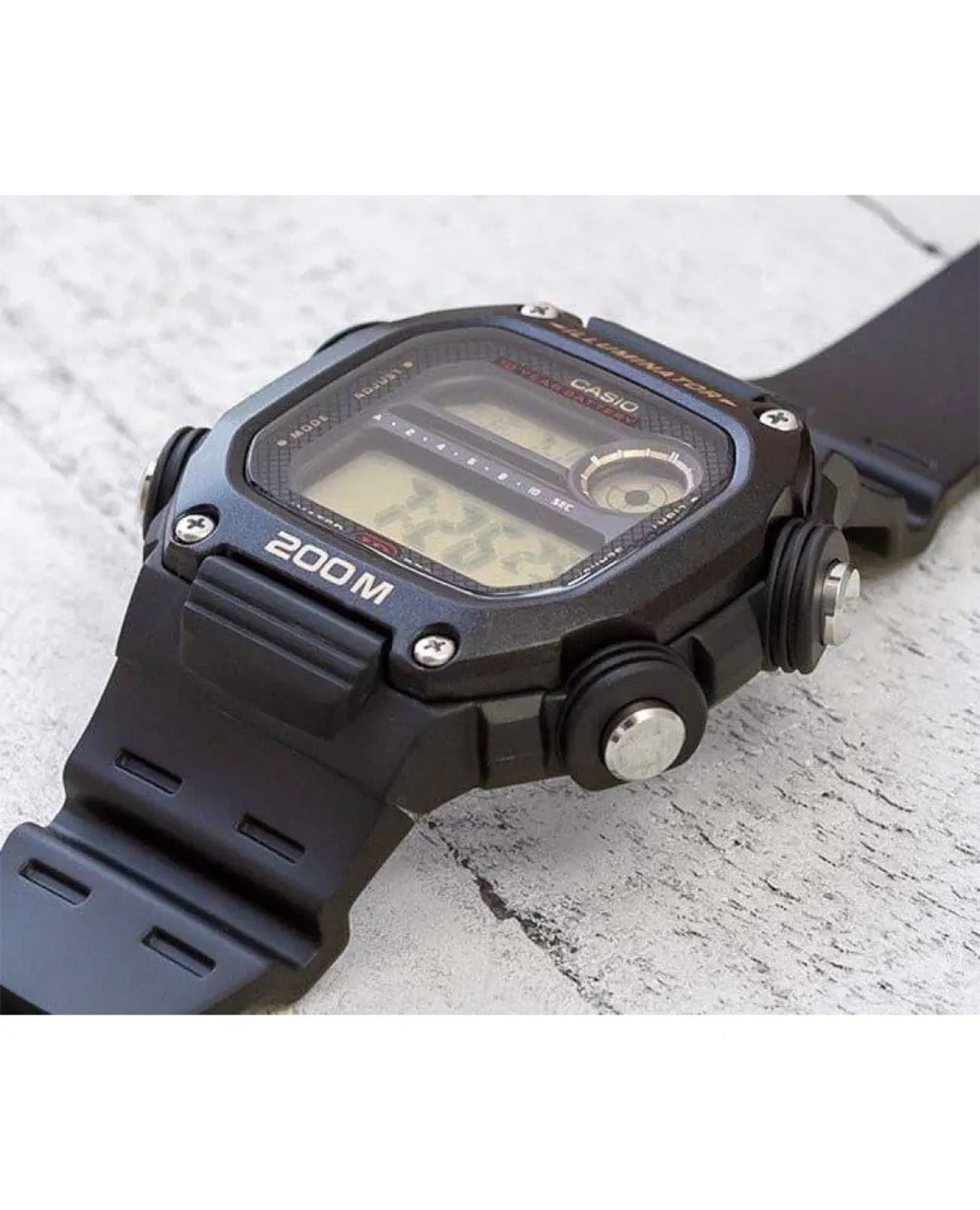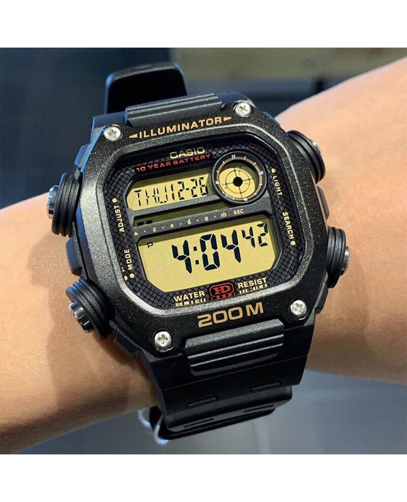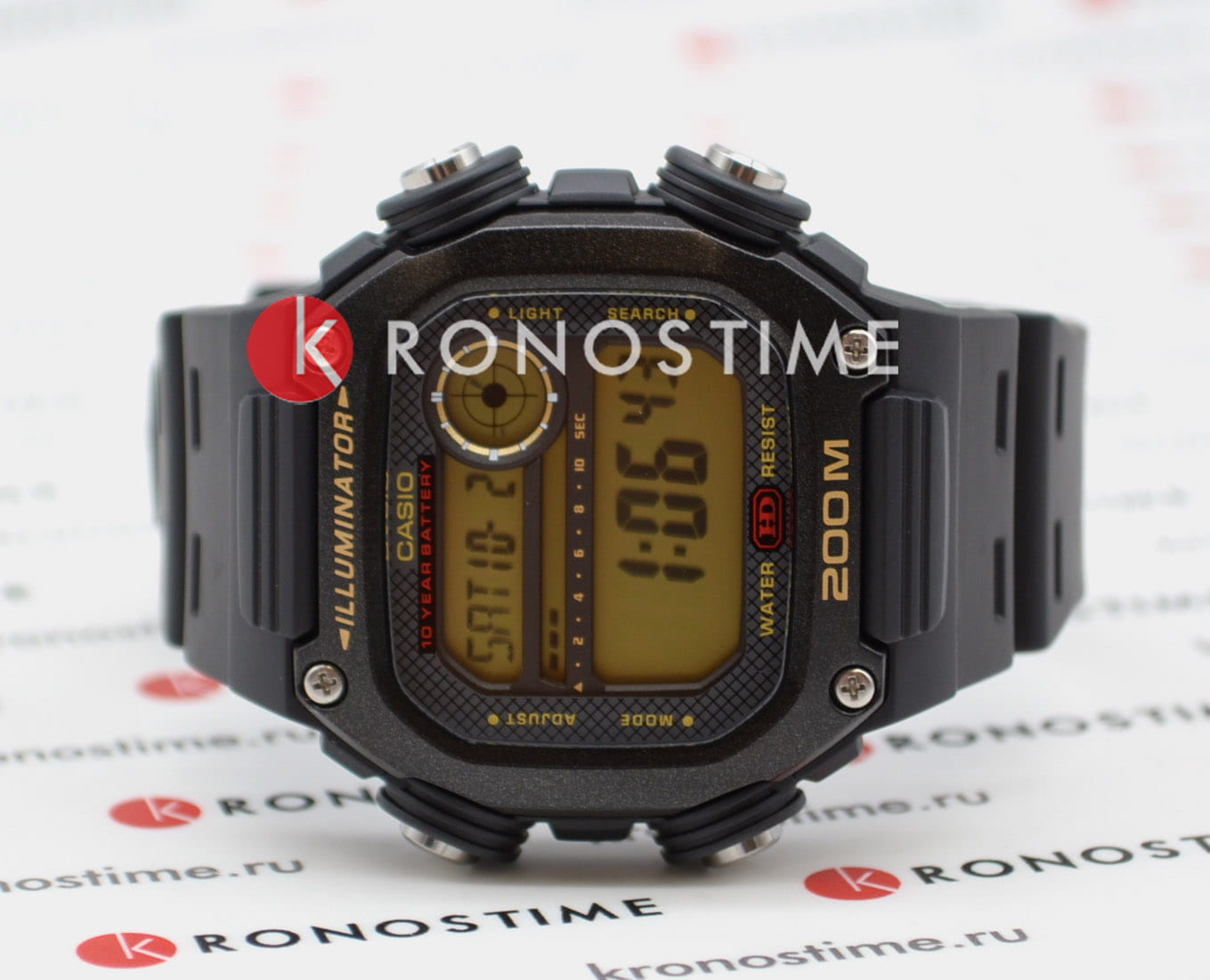 Необычная модель бюджетного ценового сегмента отличается внушительным внешним видом с красными и золотистыми деталями, круглое окошко напоминает снайперский прицел, мощные выступы защищают кнопки. Ключевой особенностью аксессуара стала батарейка, рассчитанная на 10 лет безупречной работы. Корпус и ремешок из полимерного пластика. Светодиодная подсветкаСветодиодная подсветкаСветодиодная или LED-подсветка обеспечивает появление яркого холодного свечения за счёт LED-элементов - маленьких лампочек. Они потребляют минимальное количество энергии, чаще всего можно встретить 1 светодиод, в нижней части циферблата. дисплея. Органическое стекло повышенной прочности. Водонепроницаемость 200 метров. Таймер обратного отсчёта, секундомер, будильник, ежечасный сигнал, секундомер, мировое времяМировое время Полезное часовое усложнение, отображающее время в основных городах и известных областях по всему миру, оно связано с часовыми поясами, удобно для путешественников и бизнесменов. - 49 городов, автоматический календарь. Габариты: 50,4 x 50,5 x 13,5 мм.
