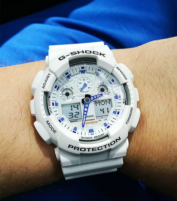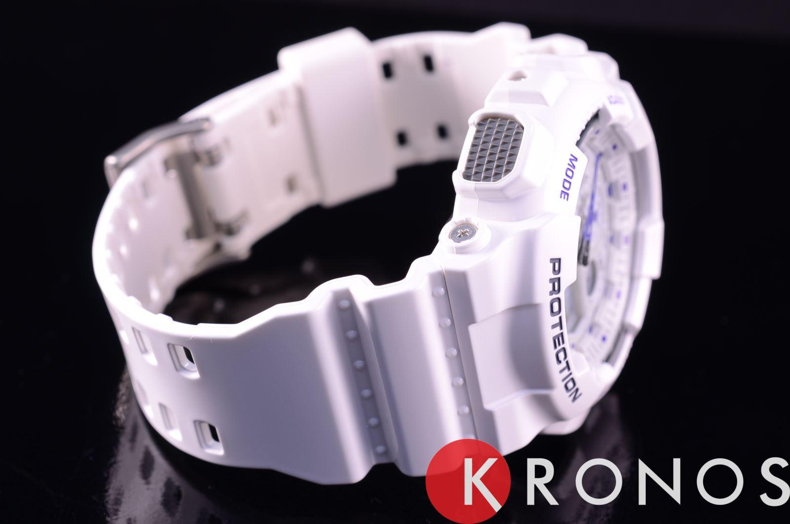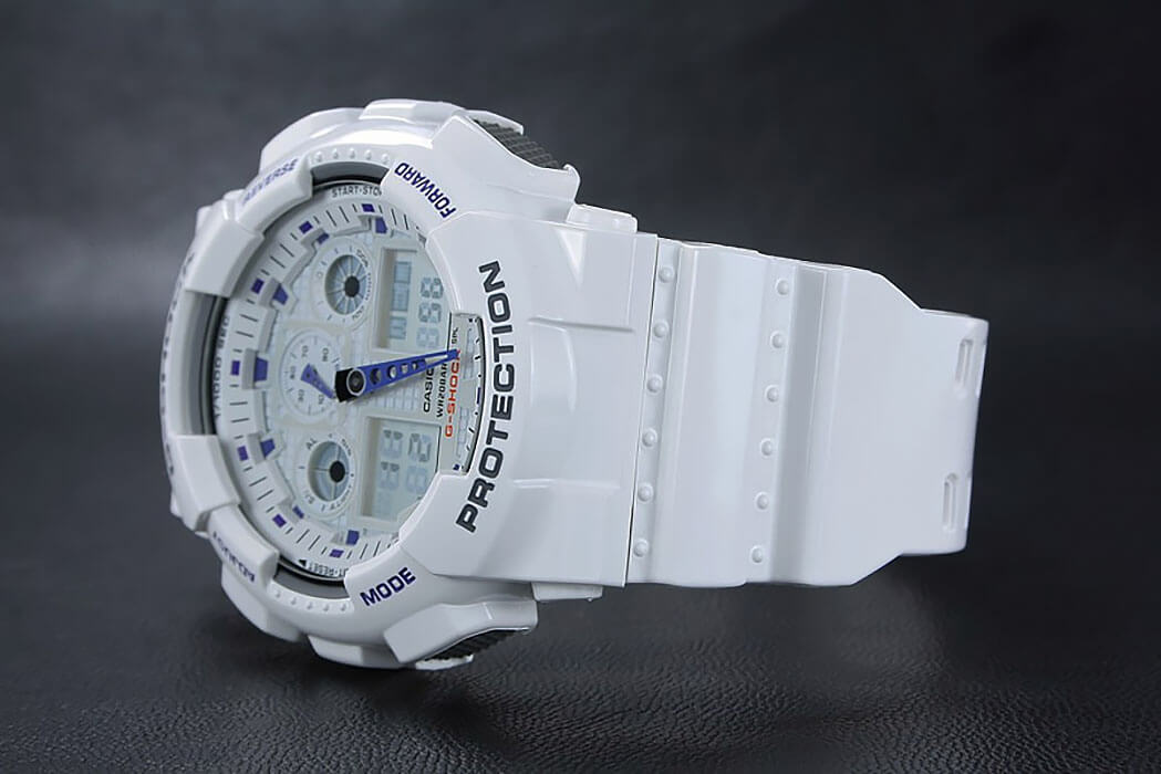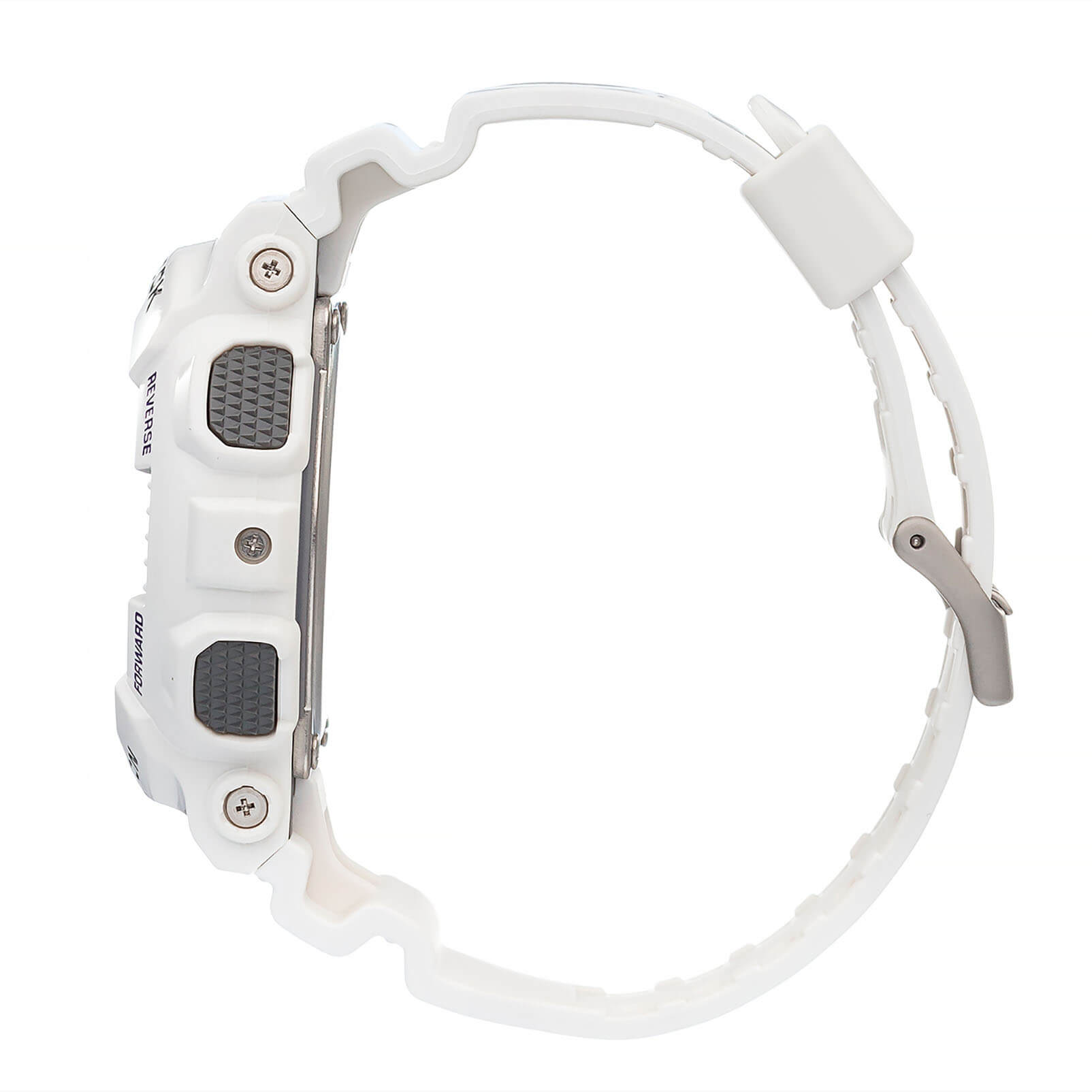 Наручные часы с массивным белым противоударным корпусомУдаропрочный корпусМеханизм заключён в корпус, выполненный из современных материалов, устойчивых к ударам, механическим повреждениям и падению с высоты: инновационный пластик, карбон, нержавеющая сталь, титан. стойко противостоят повреждениям, вибрации, падению с высоты. Стильно смотрятся синие детали и перфорированные стрелки, формируя динамичный дизайн. Японский кварцевый калибр с точностью хода +/- 15 секунд в месяц. Батарейка рассчитана на 2 года службы. Надёжный и комфортный ремешок из полимерного материала. Минеральное стекло. Яркая светодиодная подсветкаСветодиодная подсветкаСветодиодная или LED-подсветка обеспечивает появление яркого холодного свечения за счёт LED-элементов - маленьких лампочек. Они потребляют минимальное количество энергии, чаще всего можно встретить 1 светодиод, в нижней части циферблата. циферблата. 12/24-х часовое отображение времени. Устойчивость к негативному воздействию магнитного поля. Расчёт скорости по указанной дистанции. Водонепроницаемость 200 метров. Таймер обратного отсчёта, 5 будильников, автоматический календарь, мировое времяМировое время Полезное часовое усложнение, отображающее время в основных городах и известных областях по всему миру, оно связано с часовыми поясами, удобно для путешественников и бизнесменов. , секундомер, хронографХронографФункция позволяет измерять отрезки времени с особой точностью: часы, минуты, секунды. Верным признаком хронографа является наличие на циферблате 3 дополнительных окошек-счётчиков.. Габариты: 55 x 51,2 x 16,9 мм.