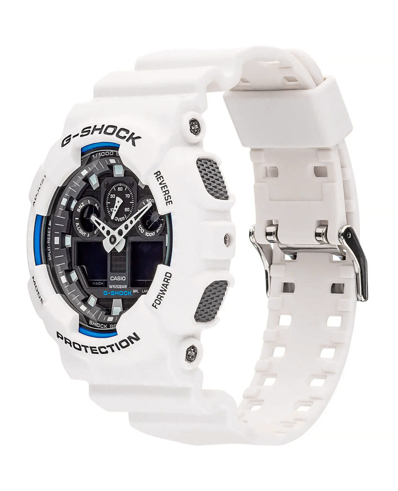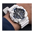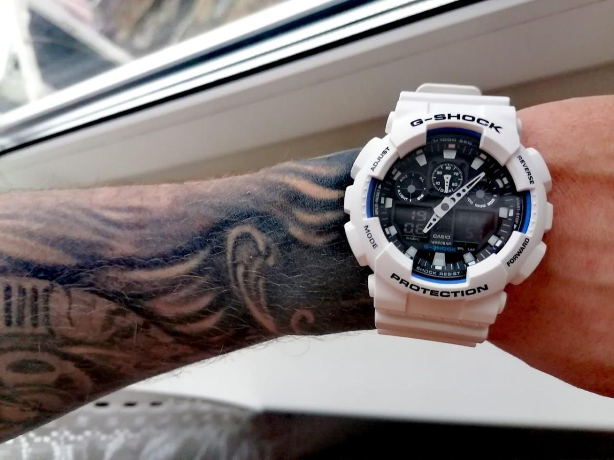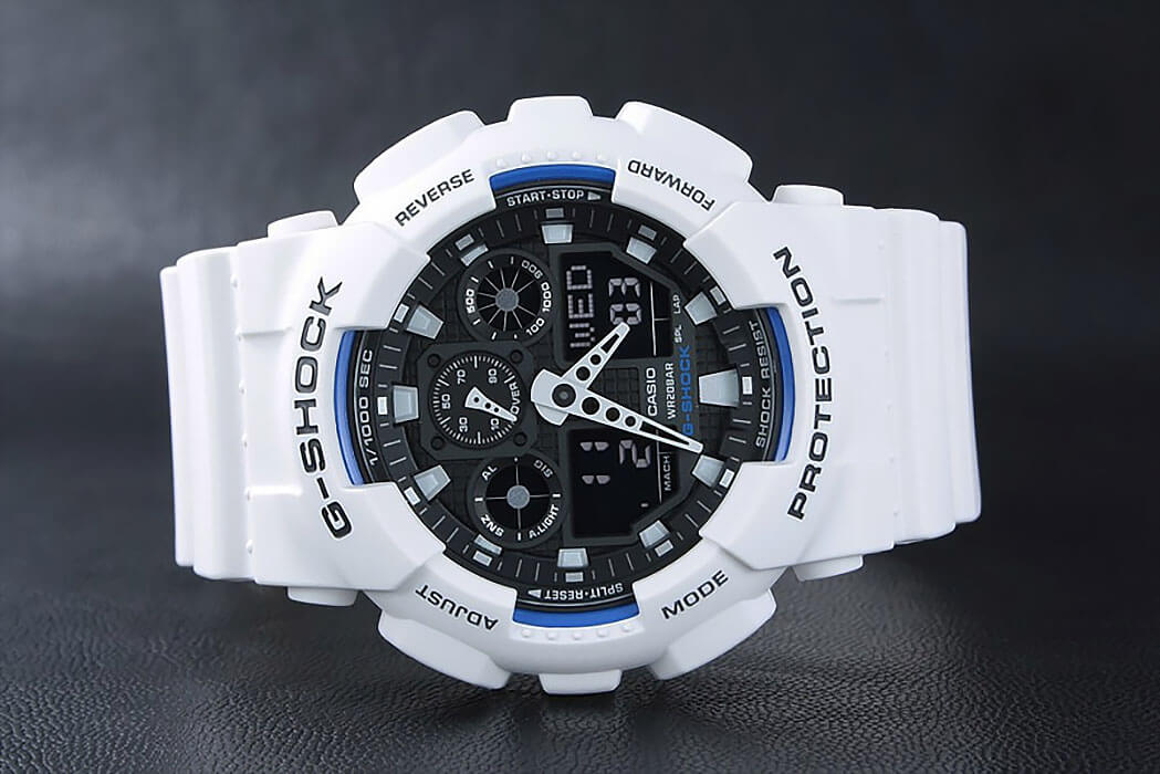 Японские мужские часы-хронографХронографФункция позволяет измерять отрезки времени с особой точностью: часы, минуты, секунды. Верным признаком хронографа является наличие на циферблате 3 дополнительных окошек-счётчиков. Casio G-Shock GA-100B-7A из коллекции G-Shock. Противоударный пластиковый корпус с карбоновыми волокнами более прочный и, в то же время, более легкий. Минеральное стеклоМинеральное стеклоМинеральное стекло представляет собой искусственно выращенный минерал кварца. Такое стекло отличается особой устойчивостью к повреждениям и царапинам. Уступает по некоторым качествам сапфировому стеклу. устойчивое к появлению царапин, обладающее высокой прозрачностью. Ударопрочный корпусУдаропрочный корпусМеханизм заключён в корпус, выполненный из современных материалов, устойчивых к ударам, механическим повреждениям и падению с высоты: инновационный пластик, карбон, нержавеющая сталь, титан. защищает механизм от ударов и вибрации. Многокомпонентный циферблат состоит из цифровых окошек указателей числа и дня недели, а также индикатора режима работы часов, который расположен в позиции 9 часов и выполнен в виде пропеллера. Светодиодная подсветкаСветодиодная подсветкаСветодиодная или LED-подсветка обеспечивает появление яркого холодного свечения за счёт LED-элементов - маленьких лампочек. Они потребляют минимальное количество энергии, чаще всего можно встретить 1 светодиод, в нижней части циферблата. освещает весь циферблат. Мировое времяМировое время Полезное часовое усложнение, отображающее время в основных городах и известных областях по всему миру, оно связано с часовыми поясами, удобно для путешественников и бизнесменов. – 48 городов (29 часовых поясов). СекундомерСекундомерСекундоме́р — прибор, способный измерять интервалы времени с точностью до долей секунды. с точностью измерения 1/100 секунды и измерением до 23 часов 59 минут 59,99 cек. ТаймерТаймерОтсчитывает секунды в обратном направлении в заданном интервале времени. обратного отсчета (диапазон времени 24 часа), автоматический календарь, 12/24 отображение времени. 5 будильниковБудильникБуди́льник — часы, в заданный момент времени подающие звуковой, световой и/или в редких случаях другой сигнал., ежечасный сигнал. Класс водозащиты: 200 метров, позволит плавать, нырять и заниматься другими водными видами спорта. Ремешок из полимерного материала на стандартной застежке.