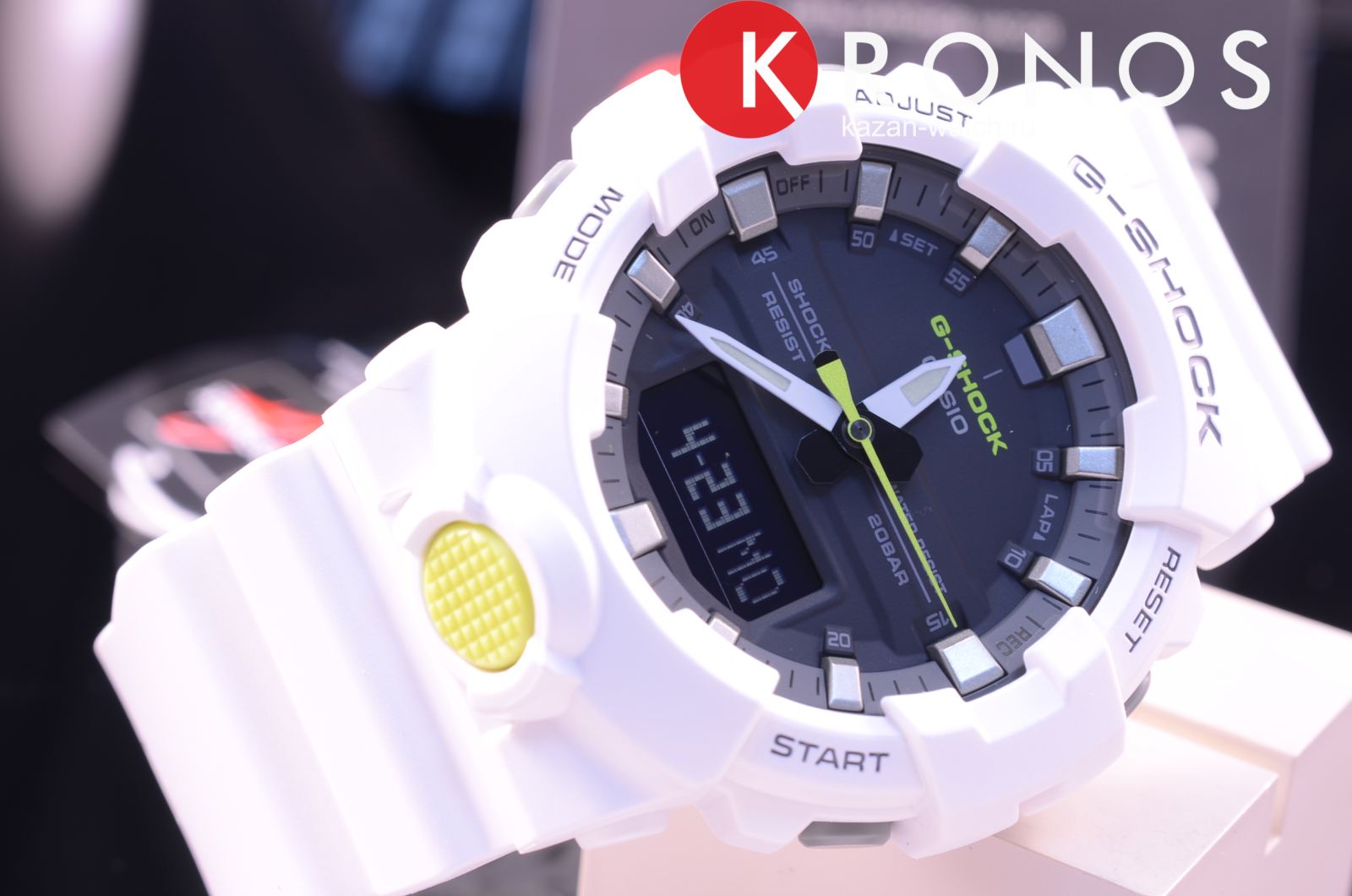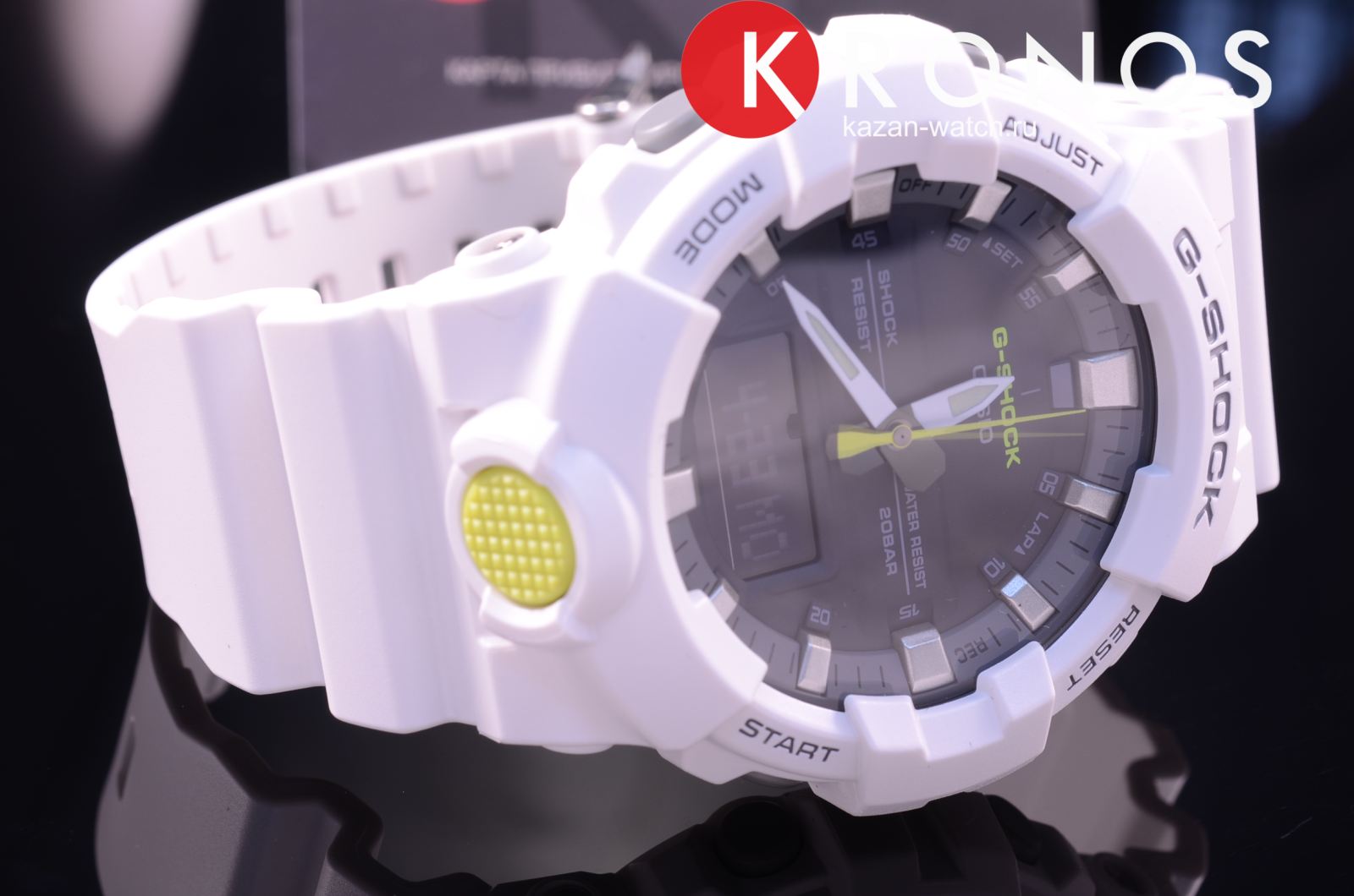 Белая модель с жёлтыми деталями точно станет запоминающейся деталью вашего образа. Часы получили обновлённый дизайн и уменьшенный противоударный корпусУдаропрочный корпусМеханизм заключён в корпус, выполненный из современных материалов, устойчивых к ударам, механическим повреждениям и падению с высоты: инновационный пластик, карбон, нержавеющая сталь, титан., если сравнивать с моделями серии GA-700. Он выполнен из полимерного пластика, что гарантирует повышенную устойчивость к ударам, повреждениям, падению с высоты. Японский кварцевый калибр с точностью хода +/- 15 секунд в месяц. Срок службы батарейки - 3 года. Функция выключения и включения звука кнопок. Стрелки с люминесцентным покрытиемЛюминесцентное покрытиеПозволяет считывать показания времени в темноте. Производители наносят на стрелки, часовые индексы, безель или поверхность циферблата светонакопительный состав, дающий холодное свечение.. Двойная светодиодная подсветкаСветодиодная подсветкаСветодиодная или LED-подсветка обеспечивает появление яркого холодного свечения за счёт LED-элементов - маленьких лампочек. Они потребляют минимальное количество энергии, чаще всего можно встретить 1 светодиод, в нижней части циферблата.. Водозащита 20 бар. Минеральное стекло. Полимерный браслет. Секундомер, таймер обратного отсчёта, мировое времяМировое время Полезное часовое усложнение, отображающее время в основных городах и известных областях по всему миру, оно связано с часовыми поясами, удобно для путешественников и бизнесменов. , 5 ежедневных будильников, автоматический календарь. Габариты: 54,1 x 48,6 x 15,5 мм.