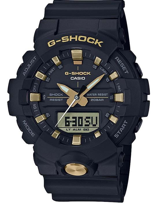 Стильная фешн-модель из серии G-SHOCK GA-800 в черном корпусе с деталями циферблата и корпуса цвета золота. Внешне часы данной серии схожи с джишоками GA-700, однако 800-серия получила уменьшенный размер корпуса и теперь вам не нужно обладать запястьем геракла, чтобы комфортно носить любимые шоки!