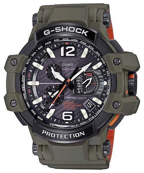 Перед вами модель из флагманской серии G-SHOCK GPW в милитаристическом дизайне цвета хаки, черным стальным безелем и яркими оранжевыми деталями — это первые в мире часы с GPS- и радио-синхронизацией времени с атомными часами в разных частях света.