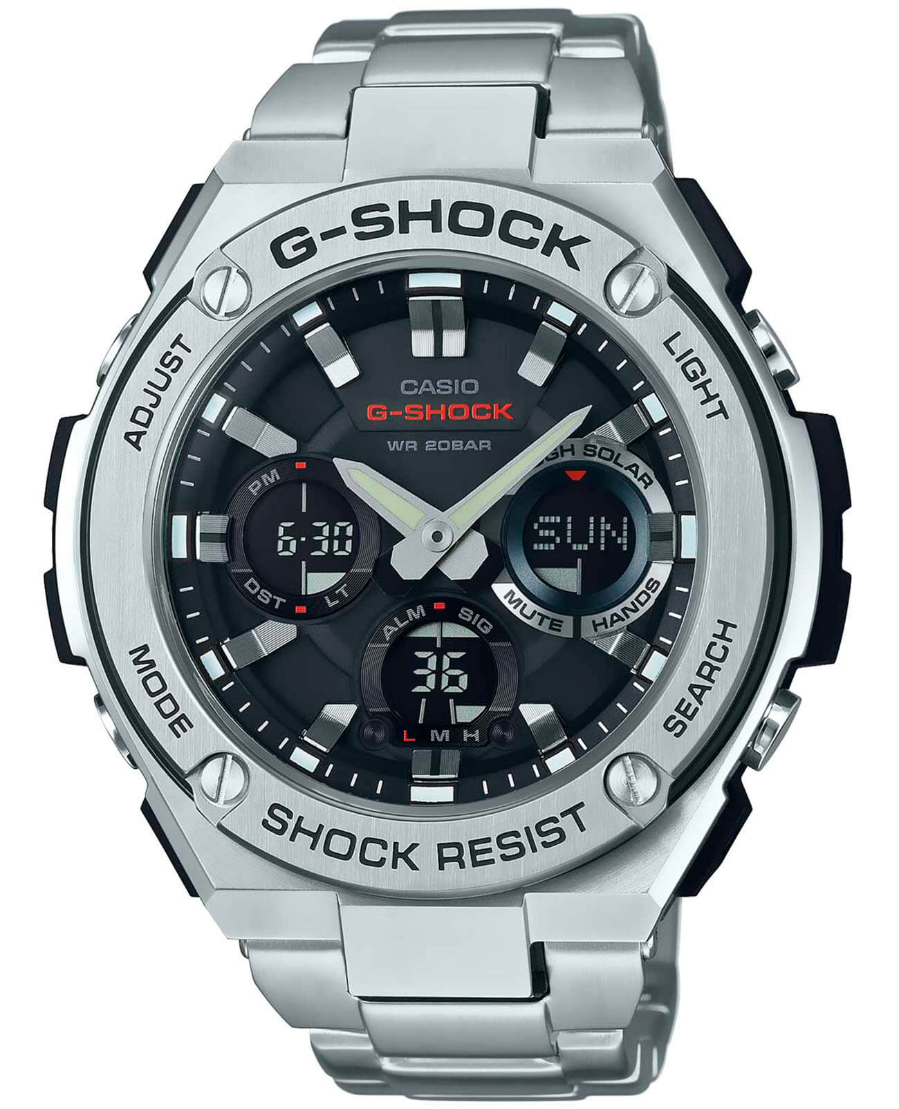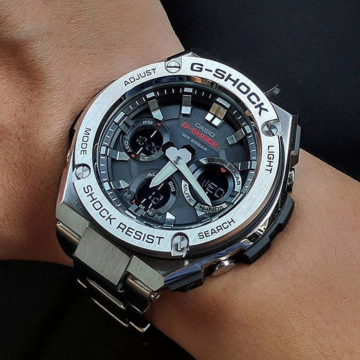 Лаконичный дизайн напоминает о классическом облике механических часов, серебристый блеск нержавеющей стали 316L никогда не потеряет актуальности. Противоударный корпусУдаропрочный корпусМеханизм заключён в корпус, выполненный из современных материалов, устойчивых к ударам, механическим повреждениям и падению с высоты: инновационный пластик, карбон, нержавеющая сталь, титан. с лёгкостью выдерживает любые нагрузки и падения с высоты, дополнительную устойчивость к повреждениям придаёт полимерная составляющая. Модель серии G-Steel - это часы на солнечной батарее , есть индикатор заряда аккумулятора. Минеральное стекло. Циферблат со светодиодной подсветкойСветодиодная подсветкаСветодиодная или LED-подсветка обеспечивает появление яркого холодного свечения за счёт LED-элементов - маленьких лампочек. Они потребляют минимальное количество энергии, чаще всего можно встретить 1 светодиод, в нижней части циферблата.. Приём радиосигнала. Таймер, секундомер, мировое времяМировое время Полезное часовое усложнение, отображающее время в основных городах и известных областях по всему миру, оно связано с часовыми поясами, удобно для путешественников и бизнесменов. , будильник, UTCUTCВсемирное кординационное время, не имеющее привязки к географическому положению Гринвича, основывается на атомном отсчёте времени. Регулировка времени осуществляется более точно, чем устаревшее GMT.