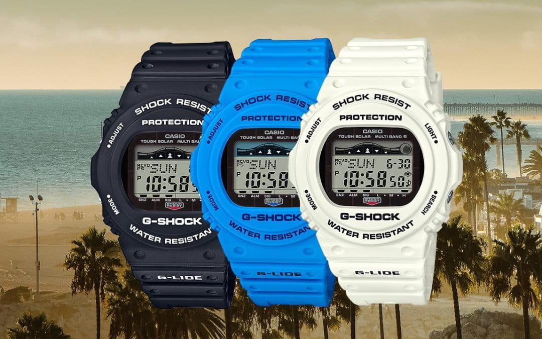 Компактная модель в олдскульном черном корпусе из профессиональной серии для серферов — G-SHOCK G-LIDE. Данная модель в белой расцветке позволяет отображать на дисплее графики приливов и фазы Луны, что позволяет получать информацию о текущих погодных условиях для серфинга, а радио-синхронизация времени позволит автоматически корректировать текущее время в любой точке мира.