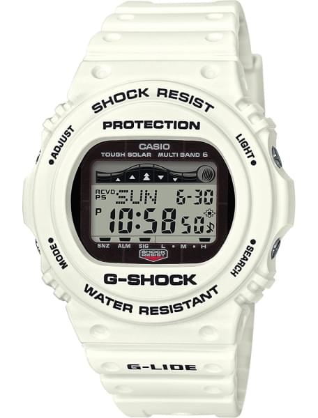 Компактная модель в олдскул корпусе из профессиональной серии для серферов — G-SHOCK G-LIDE. Данная модель в белой расцветке позволяет отображать на дисплее графики приливов и фазы Луны, что позволяет получать информацию о текущих погодных условиях для серфинга, а радио-синхронизация времени позволит автоматически корректировать текущее время в любой точке мира.