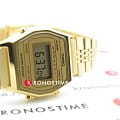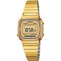 Женские электронные часы. Оснащены функциями: секундомера, таймера, календаря и подсветки. Корпус - Пластиковый; Стекло - Пластик; Водозащита - 30 м. (WR 30); Материал ремешка - Нержавеющая сталь, PVD покрытие; Цвет ремешка - Золотистый; Цвет циферблата - Золотой.
