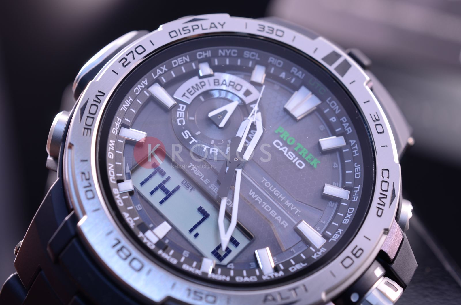 Часы, созданные для любителей активного отдыха. Питание от солнечной энергии Tough Solar - солнечные батарейки большой мощности, индикатор заряда батареи. Функция автоматического сохранения энергии. Модуль часов рассчитан на работу при низких температурах до -10°С/14°F. Прием радиосигнала (Европа, США, Япония, Китай). Технология Triple Sensor позволяет точно и легко определять сторону света, температуру и атмосферное давление. Термометр от -10° до +60°С с точностью 0,1°C. Барометр - измерение атмосферного давления от 260 до 1100 гПа (от 195 до 825 мм рт. ст.). Встроенный цифровой компас. Диапазон измерения от 0° до 359° с точностью 1°. Высотомер - встроенный датчик барометрического давления с возможностью вывода результатов в единицах высоты над уровнем моря (от -700 до 10000 метров). График набор высоты суммирует количество метров. Секундомер с точностью показаний 1/100с и временем измерения 24ч. Сплит-хронограф. Таймер обратного отсчета от 1мин до 1ч. Функция перемещения стрелок. Функция отключения/включения звука. Будильник (5 установок). Минеральное стекло устойчиво к появлению царапин. Водонепроницаемость (10 Бар).