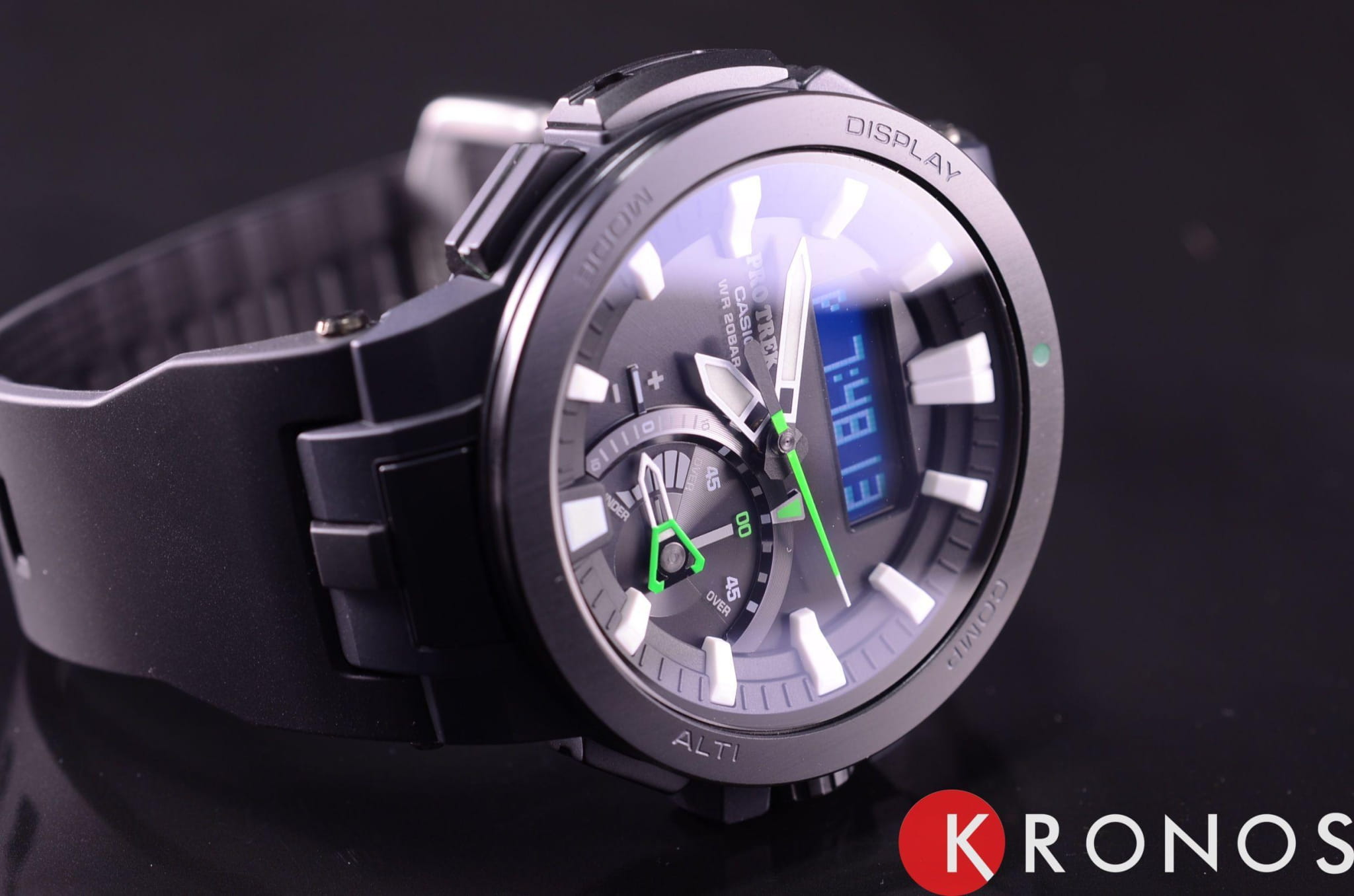 Модель с зелёными деталями отражает спортивный стиль и выигрышно смотрится на запястье. Ударопрочный корпусУдаропрочный корпусМеханизм заключён в корпус, выполненный из современных материалов, устойчивых к ударам, механическим повреждениям и падению с высоты: инновационный пластик, карбон, нержавеющая сталь, титан. выполнен из пластика и стали 316L с IP-покрытиемIP-покрытиеМетод ионного напыления. Демонстрирует повышенную устойчивость к истиранию, окислению и химическим веществам. Под воздействием высокого давления и температуры около 1500°C молекулы металла надёжно соединяются с частицами корпуса часов., что делает его устойчивым к различным видам повреждений. Наручные часы с японским кварцевым механизмом работают от солнечной батареи , функция сохранения энергии увеличивает срок работы часов без подзарядки до 21 месяца. Сапфировое стекло с покрытием «антиблик». Двойная светодиодная подсветкаСветодиодная подсветкаСветодиодная или LED-подсветка обеспечивает появление яркого холодного свечения за счёт LED-элементов - маленьких лампочек. Они потребляют минимальное количество энергии, чаще всего можно встретить 1 светодиод, в нижней части циферблата.. Водостойкость 20 бар. Устойчивость к температуре ниже -10°C. Коррекция времени радиосигналом, барометр, лунный календарь, высотомер, таймер, график восхода и заката солнца, датчик приливов и отливов, мировое времяМировое время Полезное часовое усложнение, отображающее время в основных городах и известных областях по всему миру, оно связано с часовыми поясами, удобно для путешественников и бизнесменов. – 31 часовой пояс, календарь, хронографХронографФункция позволяет измерять отрезки времени с особой точностью: часы, минуты, секунды. Верным признаком хронографа является наличие на циферблате 3 дополнительных окошек-счётчиков.. Таймер рыбалки подсказывает, какое время оптимально подходит для ловли рыбы. Габариты: 58,7 x 52,3 x 14,5 мм.