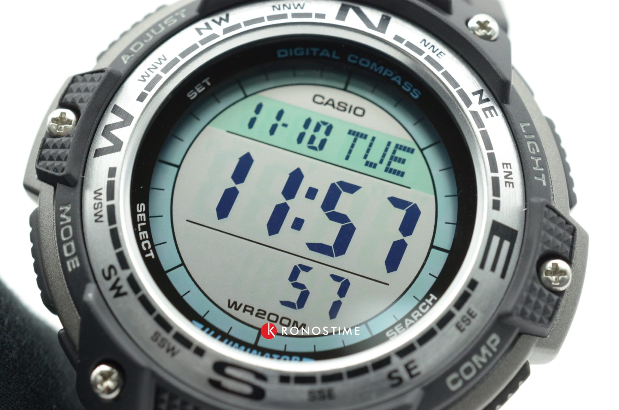 все что писали раньше... + в любом режиме (секундомер, таймер, компас/термометр,...) на дисплее показывается текущее время - очень удобно! + крупные "часовые" цифры