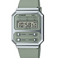 Японские наручные часы с хронографом Casio Vintage A100WEF-3ADF, кварцевый механизм с высокой точностью. Класс водозащиты: 30 метров, позволит защитить корпус от случайных брызг или капель дождя. Корпус часов изготовлен из пластика, зеленого цвета. Часы являются копией модели F-100, которая была первой моделью Casio в пластиковом корпусе. Отличительной чертой часов являются 4 кнопки на лицевой панели. ХронографХронографФункция позволяет измерять отрезки времени с особой точностью: часы, минуты, секунды. Верным признаком хронографа является наличие на циферблате 3 дополнительных окошек-счётчиков.. Циферблат подсвечивается светодиодом. Цвет подсветки: оранжевый. СекундомерСекундомерСекундоме́р — прибор, способный измерять интервалы времени с точностью до долей секунды. с точностью показаний 1/10с и временем измерения 1ч. Батарея рассчитана на 3 года. Водонепроницаемость в соответствии с DIN 8310/ISO 2281. Ремешок с классической застежкой.