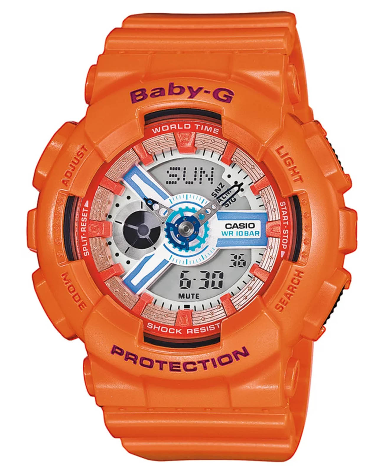 Японские женские часы-хронографХронографФункция позволяет измерять отрезки времени с особой точностью: часы, минуты, секунды. Верным признаком хронографа является наличие на циферблате 3 дополнительных окошек-счётчиков. Casio Baby-G BA-110SN-4AER из коллекции Baby-G. Серия, которая выражает спортивность и цвет, которые являются основой бренда Baby-G. Минеральное стеклоМинеральное стеклоМинеральное стекло представляет собой искусственно выращенный минерал кварца. Такое стекло отличается особой устойчивостью к повреждениям и царапинам. Уступает по некоторым качествам сапфировому стеклу. устойчивое к появлению царапин, обладающее высокой прозрачностью. Корпус часов изготовлен из полимерного материала. Функции: автоматическая светодиодная подсветка. Ударопрочный корпусУдаропрочный корпусМеханизм заключён в корпус, выполненный из современных материалов, устойчивых к ударам, механическим повреждениям и падению с высоты: инновационный пластик, карбон, нержавеющая сталь, титан. защищает механизм от ударов и вибрации. Функция Мирового времениМировое время Полезное часовое усложнение, отображающее время в основных городах и известных областях по всему миру, оно связано с часовыми поясами, удобно для путешественников и бизнесменов. . "stopwatch" "Секундомер"} с точностью измерения 1/100 секунды и измерением до 23 часов 59 минут 59,99 cек. ТаймерТаймерОтсчитывает секунды в обратном направлении в заданном интервале времени. обратного отсчета (диапазон времени 24 часа), автоматический календарь, 12/24 отображение времени. 5 ежедневных будильниковБудильникБуди́льник — часы, в заданный момент времени подающие звуковой, световой и/или в редких случаях другой сигнал.. Функция включения/отключения звука. Класс водозащиты: 100 метров, позволит плавать без погружения. Ремешок из полимерного материала на стандартной застежке.