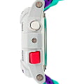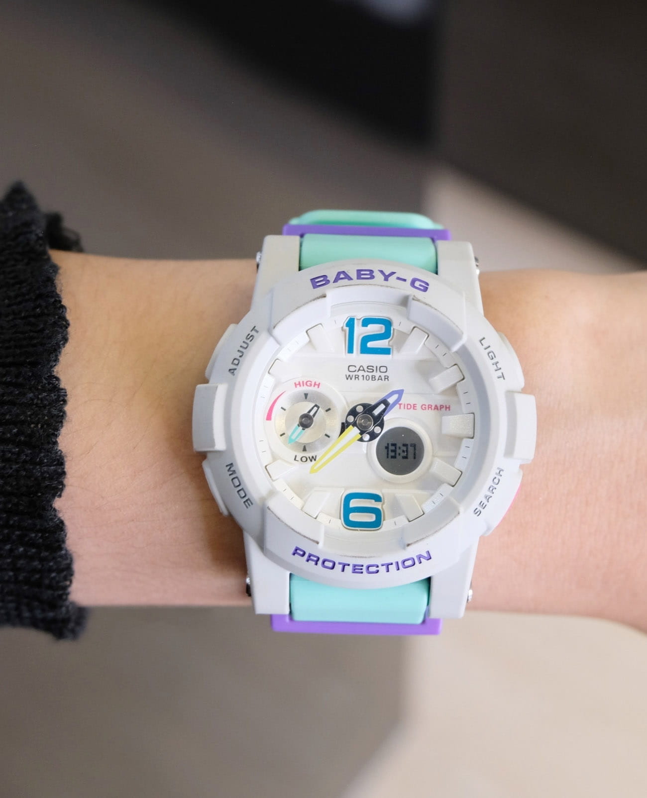 Японские женские часы-хронографХронографФункция позволяет измерять отрезки времени с особой точностью: часы, минуты, секунды. Верным признаком хронографа является наличие на циферблате 3 дополнительных окошек-счётчиков. Casio Baby-G BGA-180-3BDR из коллекции Baby-G. Минеральное стеклоМинеральное стеклоМинеральное стекло представляет собой искусственно выращенный минерал кварца. Такое стекло отличается особой устойчивостью к повреждениям и царапинам. Уступает по некоторым качествам сапфировому стеклу. устойчивое к появлению царапин, обладающее высокой прозрачностью. Корпус часов изготовлен из полимерного материала. Светодиодная подсветкаСветодиодная подсветкаСветодиодная или LED-подсветка обеспечивает появление яркого холодного свечения за счёт LED-элементов - маленьких лампочек. Они потребляют минимальное количество энергии, чаще всего можно встретить 1 светодиод, в нижней части циферблата. с функцией послесвечения. Ударопрочный корпусУдаропрочный корпусМеханизм заключён в корпус, выполненный из современных материалов, устойчивых к ударам, механическим повреждениям и падению с высоты: инновационный пластик, карбон, нержавеющая сталь, титан. защищает механизм от ударов и вибрации. Функция Мирового времениМировое время Полезное часовое усложнение, отображающее время в основных городах и известных областях по всему миру, оно связано с часовыми поясами, удобно для путешественников и бизнесменов. и летнего времени, второй часовой пояс. СекундомерСекундомерСекундоме́р — прибор, способный измерять интервалы времени с точностью до долей секунды. с точностью измерения 1/100 секунды и измерением до 23 часов 59 минут 59,99 cек. ТаймерТаймерОтсчитывает секунды в обратном направлении в заданном интервале времени. обратного отсчета (диапазон времени 24 часа), автоматический календарь, 12/24 отображение времени. 5 ежедневных будильниковБудильникБуди́льник — часы, в заданный момент времени подающие звуковой, световой и/или в редких случаях другой сигнал.. Термометр от -10 до 60°C . Отображение возраста и фазы луны. Отображение сведений о приливах и отливах (уровень прилива на ближайшие 12 часов, и на определенную дату и время). Класс водозащиты: 100 метров, позволит плавать без погружения. Ремешок из полимерного материала на стандартной застежке.