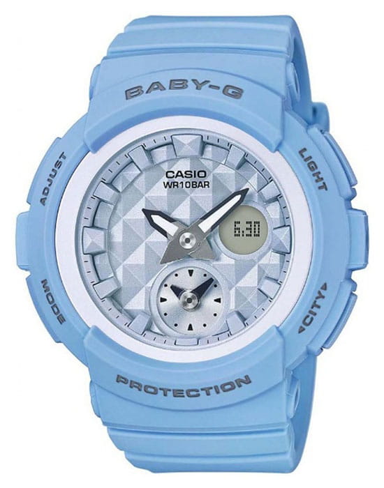 Женские противоударные японские наручные часы Casio Baby-G BGA-190BE-2A, кварцевый механизм с высокой точностью. Класс водозащиты: 100 метров, позволит плавать, нырять и заниматься другими водными видами спорта. Корпус часов изготовлен из пластика, голубого цвета.