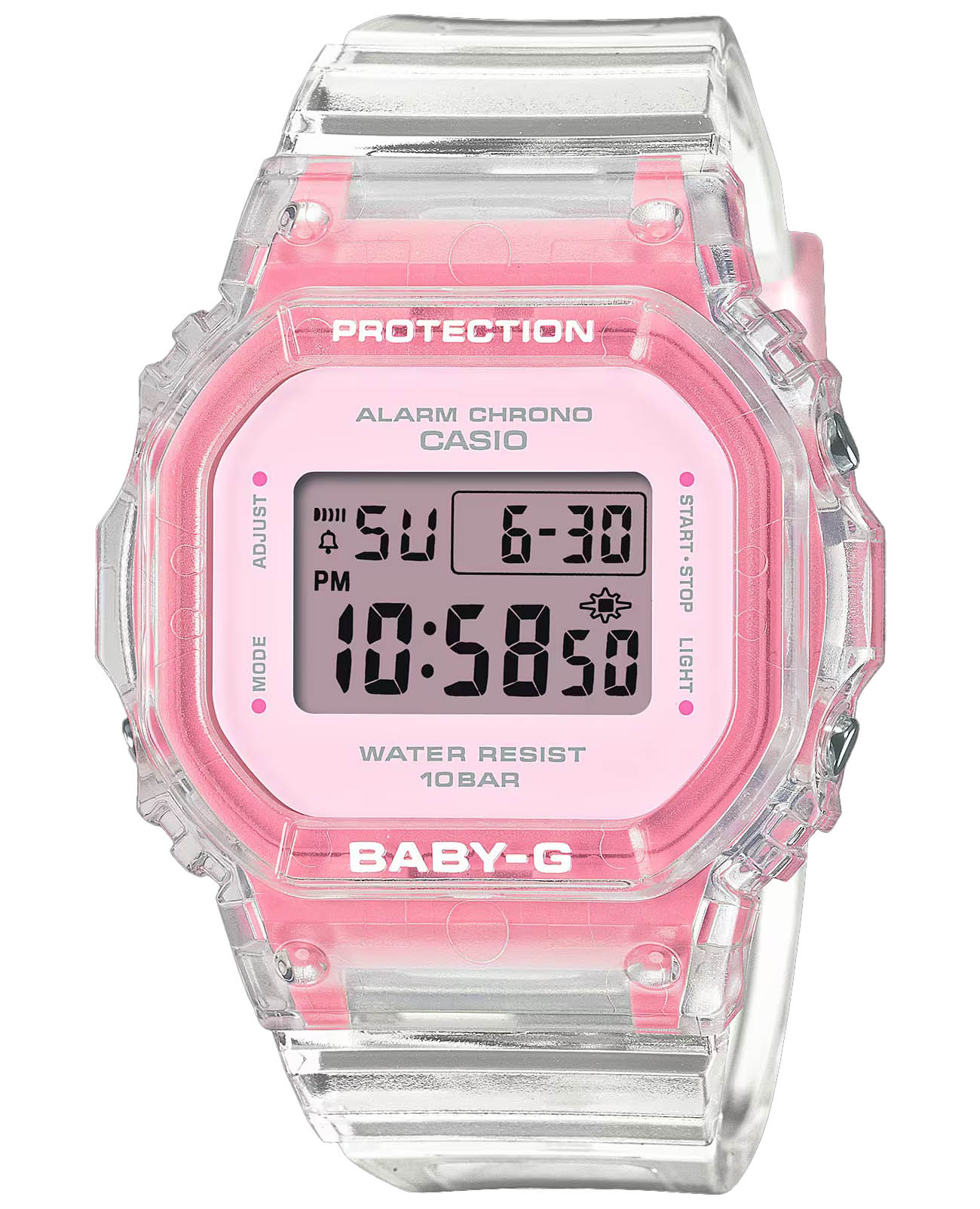Женские противоударные японские часы Casio Baby-G BGD-565SJ-7, кварцевый механизм с высокой точностью. Класс водозащиты: 100 метров, позволит плавать, нырять и заниматься другими водными видами спорта. Корпус и браслет часов изготовлены из пластика. Ударопрочный корпусУдаропрочный корпусМеханизм заключён в корпус, выполненный из современных материалов, устойчивых к ударам, механическим повреждениям и падению с высоты: инновационный пластик, карбон, нержавеющая сталь, титан. защищает механизм от ударов и вибрации. Минеральное стеклоМинеральное стеклоМинеральное стекло представляет собой искусственно выращенный минерал кварца. Такое стекло отличается особой устойчивостью к повреждениям и царапинам. Уступает по некоторым качествам сапфировому стеклу. устойчивое к мелким механическим повреждениям. После первичной настройки автоматический вечный календарьВечный календарьКлассическое часовое усложнение, представляющее собой календарь, рассчитанный на несколько лет вперёд (стандартно – до 2099 года). Определяет текущую дату, день недели, месяц. всегда отображает точную дату. СекундомерСекундомерСекундоме́р — прибор, способный измерять интервалы времени с точностью до долей секунды. измеряет прошедшее время с точностью в 1/100 секунды, пределы измерения достигают 24 часов. Электролюминесцентная подсветкаЭлектролюминесцентная подсветкаЭлектролюминесцентная панель устанавливается под ЖК-экраном часов, при нажатии кнопки электричество преобразуется в свет за счёт подачи напряжения на атомы фосфора, такой тип подсветки позволяет освещать весь циферблат. освещает весь циферблат, после отпускания кнопки свечение продолжается еще некоторое время. Модель имеет пять независимых будильниковБудильникБуди́льник — часы, в заданный момент времени подающие звуковой, световой и/или в редких случаях другой сигнал. и ежечасный сигнал.